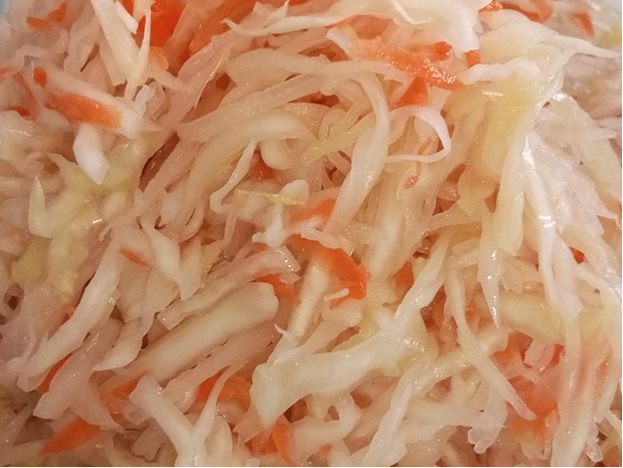 В семье больше предпочитают суточную капусту, но иногда хочется квашеную, и этот рецепт именно для нас, сделали немного, съели, при желании приготовили еще. Ингредиенты: - капуста – 1,5 кг.; - морковь – 1 среднего размера; - соль – 1 ст. ложка без бугра или по вкусу. Капусту нашинковала, морковь натерла на крупной терке. К нашинкованной капусте добавила соль, хорошо помяла руками для получения сока. Добавила морковь, перемешала. Установила гнет как на фото, оставила на столе в таком виде на 3 дня, если прохладно на 4 дня. Каждый день в течение 3 или 4 дней один или два раза в сутки (как получится) снимаю гнет с капусты, протыкаю в нескольких местах палочкой для роллов или ножом для того чтобы выпустить образовавшиеся газы и чтобы капуста не становилась горькой, устанавливаю гнет обратно. Через 3-4 дня капусту можно пробовать или переложить в банку, закрыть крышкой и убрать в холодильник. Приятного аппетита.