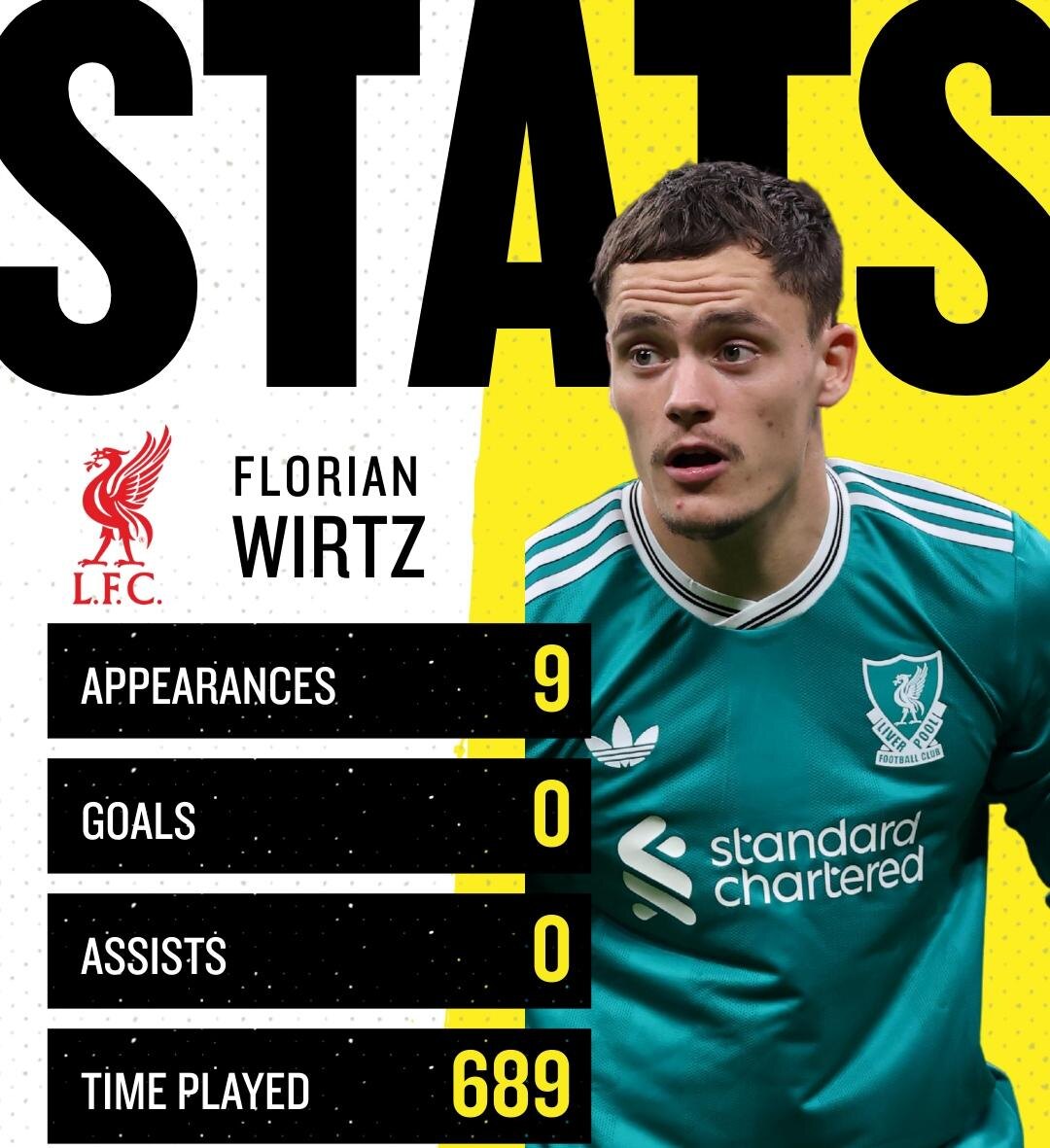 Флориан Вирц в "Ливерпуле": 9 матчей, 689 сыгранных минут, 0 результативных действий 📊