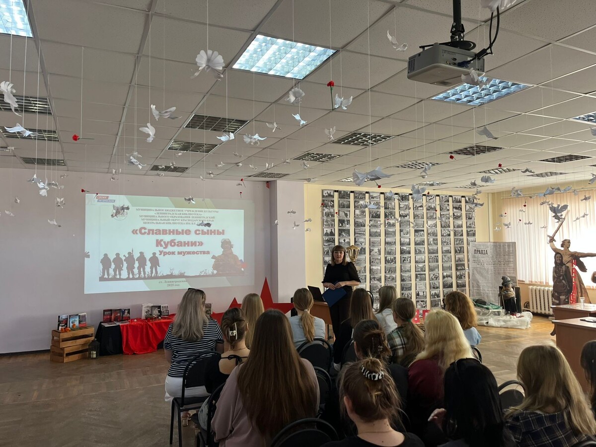 🇷🇺Студенты группы Д3Б дошкольного отделения вместе с куратором Лотышовой И. Г. приняли участие в Уроке Мужества «Славные сыны Кубани», прошедшем в централизованной библиотеке Ленинградского МО. Герои Отечества — это не только солдаты и офицеры, но и все те, кто в разные времена проявлял мужество и верность в служении Родине. Их подвиги вдохновляют нас на добрые дела и благородные поступки. Особенно это актуально сегодня, когда идёт специальная военная операция. Где каждый день нас и наших близких защищают от врагов. Разговор шел о тех, кто пошёл на защиту Родины, но к сожалению, не вернулся. Сейчас по официальным данным не вернулись к своим родным более 150 человек, которые были призваны с военкомата ст. Ленинградской. Мы выражаем глубокую благодарность всем, кто служил и продолжает служить на передовой, тем, кто защищает наши ценности, культуру и традиции. Победа будет за нами! #ПоддержкаБойцов #МыВместе #МыБлагоДарим #ЛСПК