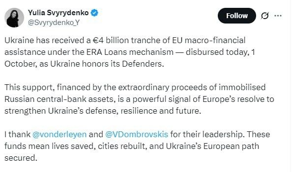 Евросоюз выплатил Украине новый транш размером в €4 миллиарда из доходов от замороженных активов РФ