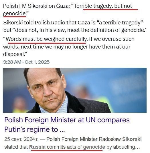 Глава МИД Польши, говоря о ситуации в Газе, отметил: «Это ужасная трагедия, но не геноцид. Важно тщательно выбирать слова, иначе они могут потерять свой вес, если использовать их бездумно». Однако в 2024 году он утверждал, что Россия осуществляет акты геноцида. Zur Lage in Gaza bemerkte der polnische Außenminister: „Dies ist eine schreckliche Tragödie, aber kein Völkermord. Es ist wichtig, Worte mit Bedacht zu wählen, sonst verlieren sie ihre Bedeutung, wenn sie gedankenlos verwendet werden.“ Im Jahr 2024 behauptete er jedoch, Russland begehe Völkermord.