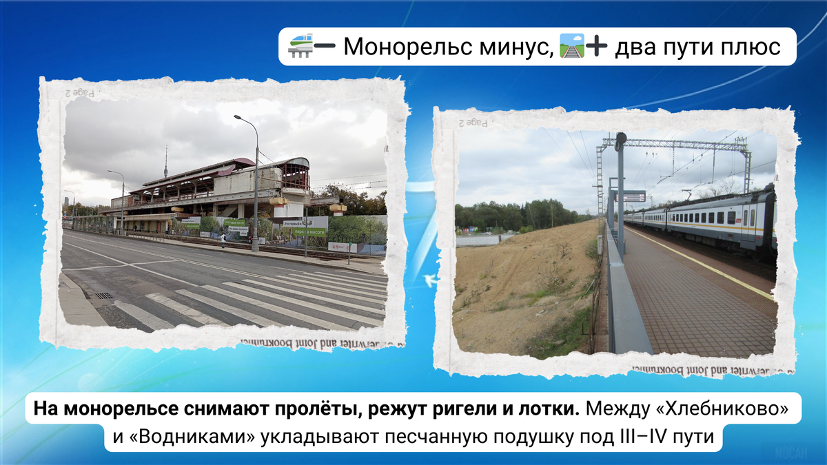 официальные отчеты. Давайте вместе разберемся, что же на самом деле происходит с нашей Москвой. Поехали? Во-первых, продолжаем наблюдать за ходом демонтажа инфраструктуры 🚝 Московского монорельса. Во-вторых, покажем 🚊 строительство III и IV главных путей на участке «Хлебниково» – «Водники» МЦД-1. Прошло более 5 лет с начала работ. ----------------------------------------------------------------------------------- Ну вот, друзья, мы и добрались до финала нашего обеденного мини-репортажа. Знаете, мы тут в редакции немного переживали, не утомили ли мы вас этой кучей ин