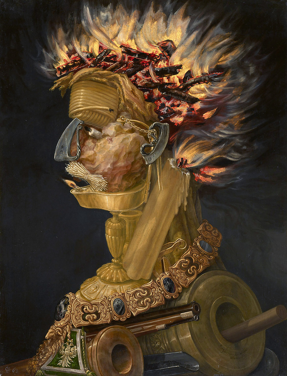 Перед нами картина итальянского художника Джузеппе Арчимбольдо (1527–1593). Она входит в цикл, посвящённый четырём алхимическим стихиям: Земле, Воде, Воздуху и Огню. Он был заказан императором Священной Римской империи Максимилианом II Габсбургом (правил в 1564–1576 годах). Как и свойственно Арчимбольдо, стихия Огня представлена вымышленным портретом человека, созданного из неодушевлённых предметов: его нос и ухо сделаны из кремня и стали, волосы – из горящего дерева, тело – из пушек, пистолета, горящей свечи и т.д. На мужчине также надето большое ожерелье с золотым руном – это отсылка к Римско-католическому ордену Золотого Руна, очень престижному рыцарскому ордену. Рядом с золотым руном висит зелёная емкость с порохом с двуглавым орлом – этот орёл является символом Священной Римской империи. Картина 1566 года. Находится она в Музее истории искусств в Вене. P.S. Приглашаем вас посетить наш телеграмм-канал, там много всего интересно. А уж сколько прекрасных картин у нас в вк. Жде
