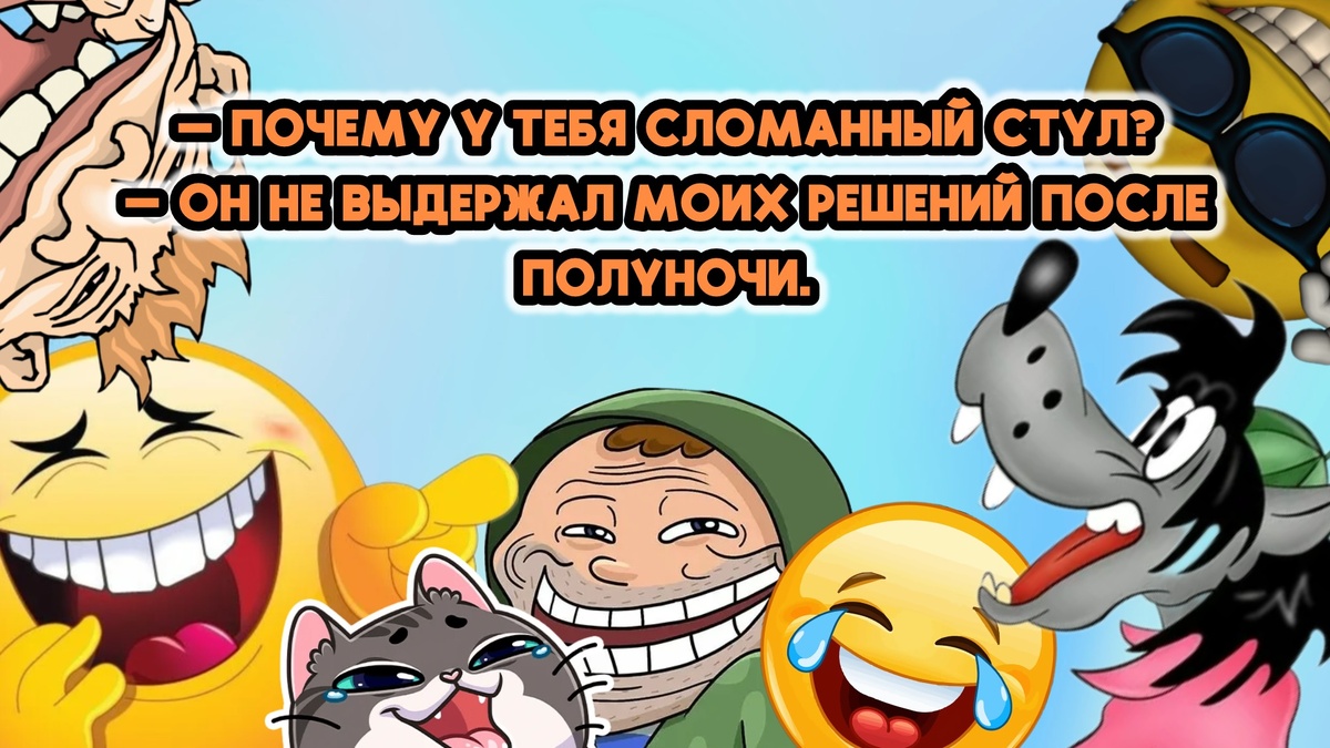 1 Муж приходит домой уставший. Жена спрашивает: — Ты где был? — На совещании. — А почему рубашка вся в кофе и на брюках тортик? — Это совещание с энергетическим и сладким сопровождением. — Энергия твоя, а уборка — моя! 2 Учительница спрашивает Вовочку: — Почему домашку не сделал? — Ручка сломалась. — А карандаш? — Он тоже сломался в знак протеста. Теперь жду поддержки линейки. 3 Парень идёт на свидание без цветов. Девушка: — Где цветы? — Забыл. — А романтика? — Живая и честная. 4 Бабушка ворчит: — Ты весь день за компьютером! — Я учусь! — Учёба — это когда мозг работает, а не только пальцы. 5 Муж звонит жене: — Купил подарок! — Какой? — Коробку шоколада. — А зачем ещё коробка? — Чтобы кот думал, что он главный. 6 В автобусе парень уступает место бабушке. Она: — Спасибо, милок. — Не за что, интернет закончился, вот и наблюдаю жизнь. 7 Сосед спрашивает: — Почему ремонт ночью? — Проверяю, кто реально спит. — И кто? — Никто. 8 Мужик в ресторане жалуется: — Ваш суп прозрачный! Офи
