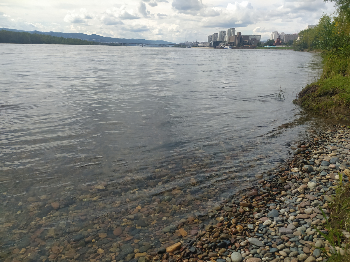 Очень хотелось искупаться в Енисее. Поэтому я вышла к реке, убедилась, что вода там чистая, и быстро искупалась. Дело в том, что в начале там мелко, но в глубину там выходить просто опасно: очень сильное течение. Поэтому я просто окунулась в Енисейскую воду.