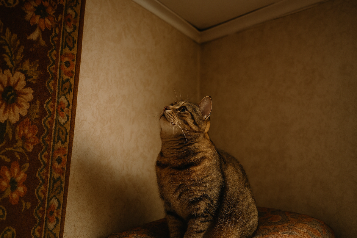 Кошка была на месте. Сидела на пуфике, как королева тревожного царства, и действительно смотрела — не просто на потолок, а строго в одну и ту же точку у карниза. И взгляд у неё был… как бы это сказать? Не "голодная, хочу корм", а скорее "я знаю, кто ты, человек, и мне не понравилось твоё лицо".