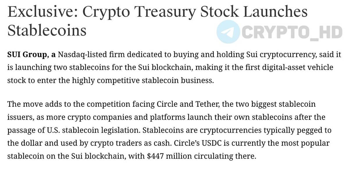 #sui 👀 В Sui Group Holdings готовятся к запуску сразу двух стейблкоинов на блокчейне Sui: ➤ #suiUSDe – стейблкоин с доходностью для держателей. ➤ #USDi – классический стейблкоин без доходности. Запуск ожидается до конца этого года, партнер по выпуску – Ethena (#ENA). Sui Group Holdings (ранее Mill City Ventures) –компания, управляющая цифровыми активами на блокчейне Sui. Акции котируются на бирже Nasdaq. Crypto Headlines