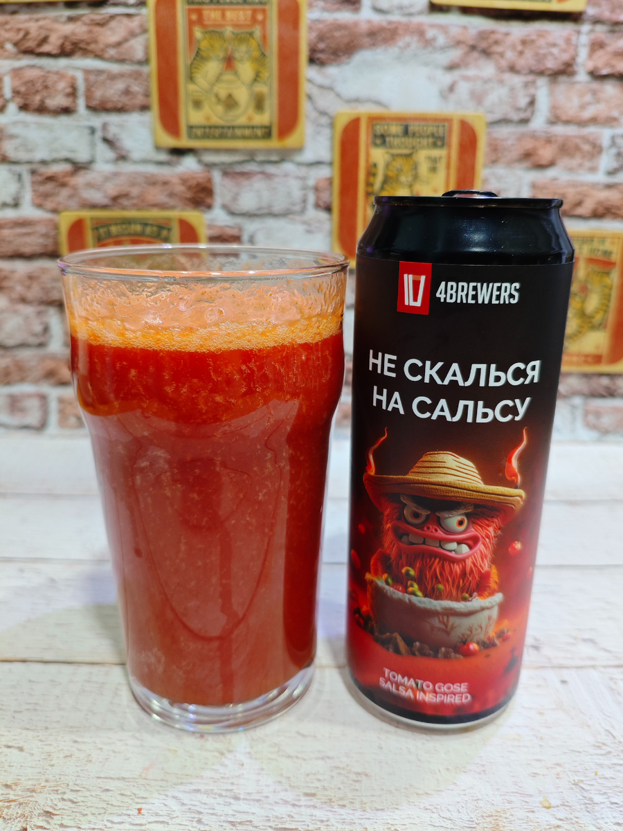 И снова пивоварня 4BREWERS (ООО "Четыре пивовара") из города Владимир со своим томатным гозе из "монструозной" линейки. ********************************************************************************** Как всегда описание на сайте пивоварни полностью повторяет описание на этикетке банки: Когда солнце клонилось к закату над пустынной деревушкой Санто-Корнишоно, туда въехал молчаливый всадник в сомбреро, наводивший ужас на всю округу. Мистер Сальса не щадил никого. С огненным перцем на поясе и взглядом, от которого умирали кактусы, Сальса нёс справедливость везде, куда только мог дотянуться. И теперь пришло наше время... Смотрите во всех барах страны. 18+ Насыщенный светлый кислый эль. Сочные томаты, ароматный красный лук и чесночок во вкусе дополняются выраженными нотами базилика, кориандра и кинзы. ********************************************************************************** Плотность: Объём действительного экстракта 4%. Состав: вода подготовленная (исправленная), солод пивоварен