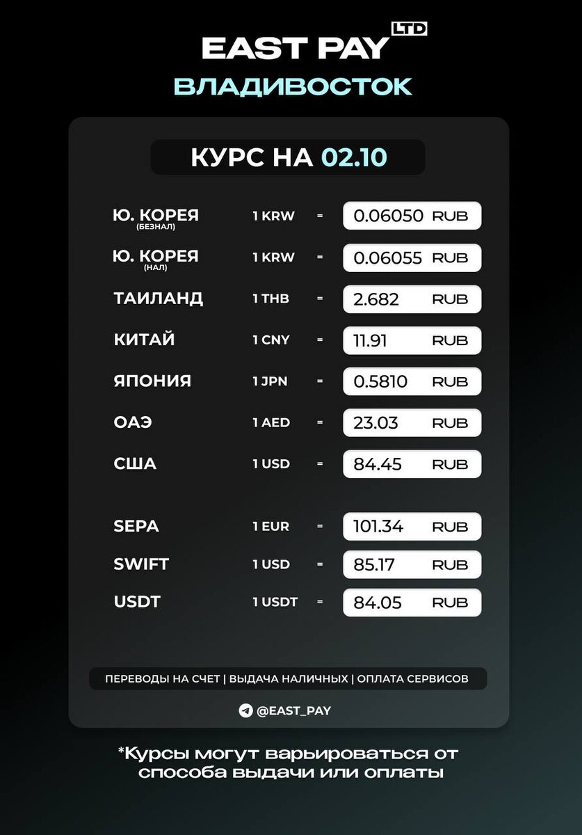 💙SWIFT / SEPA переводы 💙Пополнение зарубежных счетов 💙Выдача наличных за границей 💙Криптовалюты 🔘В течение дня курс может меняться. Рекомендуем уточнять актуальный курс у менеджера. ❗️ВАЖНО: мы получили лицензию и открыли офис в Корее. Подробности можете узнать у менеджера. 🔴🔴🔴🔴🔴🔴🔴🔴🔴🔴 🟠Написать менеджеру: @east_pay_world 🟠Сделать просчет самостоятельно в боте: @East_PaySer_bot ✈️ Подписаться на «East Pay»