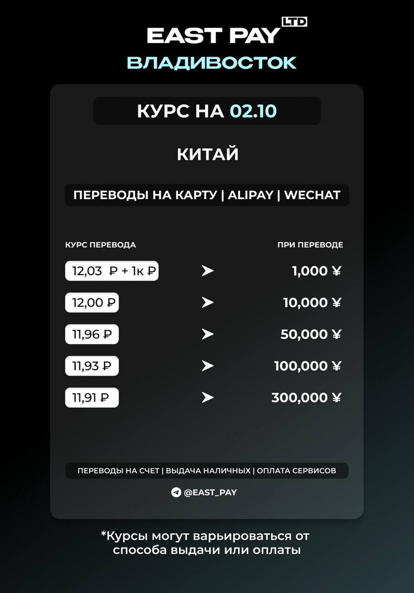 КУРСЫ НА КИТАЙ 💙Переводы на китайскую карту 💙Alipay / Wechat 🔘В течение дня курс может меняться. Рекомендуем уточнять актуальный курс у менеджера. ❗️ВАЖНО: мы получили лицензию и открыли офис в Корее. Подробности можете узнать у менеджера. 🔴🔴🔴🔴🔴🔴🔴🔴🔴🔴 🟠Написать менеджеру: @east_pay_world 🟠Сделать просчет самостоятельно в боте: @East_PaySer_bot ✈️ Подписаться на «East Pay»
