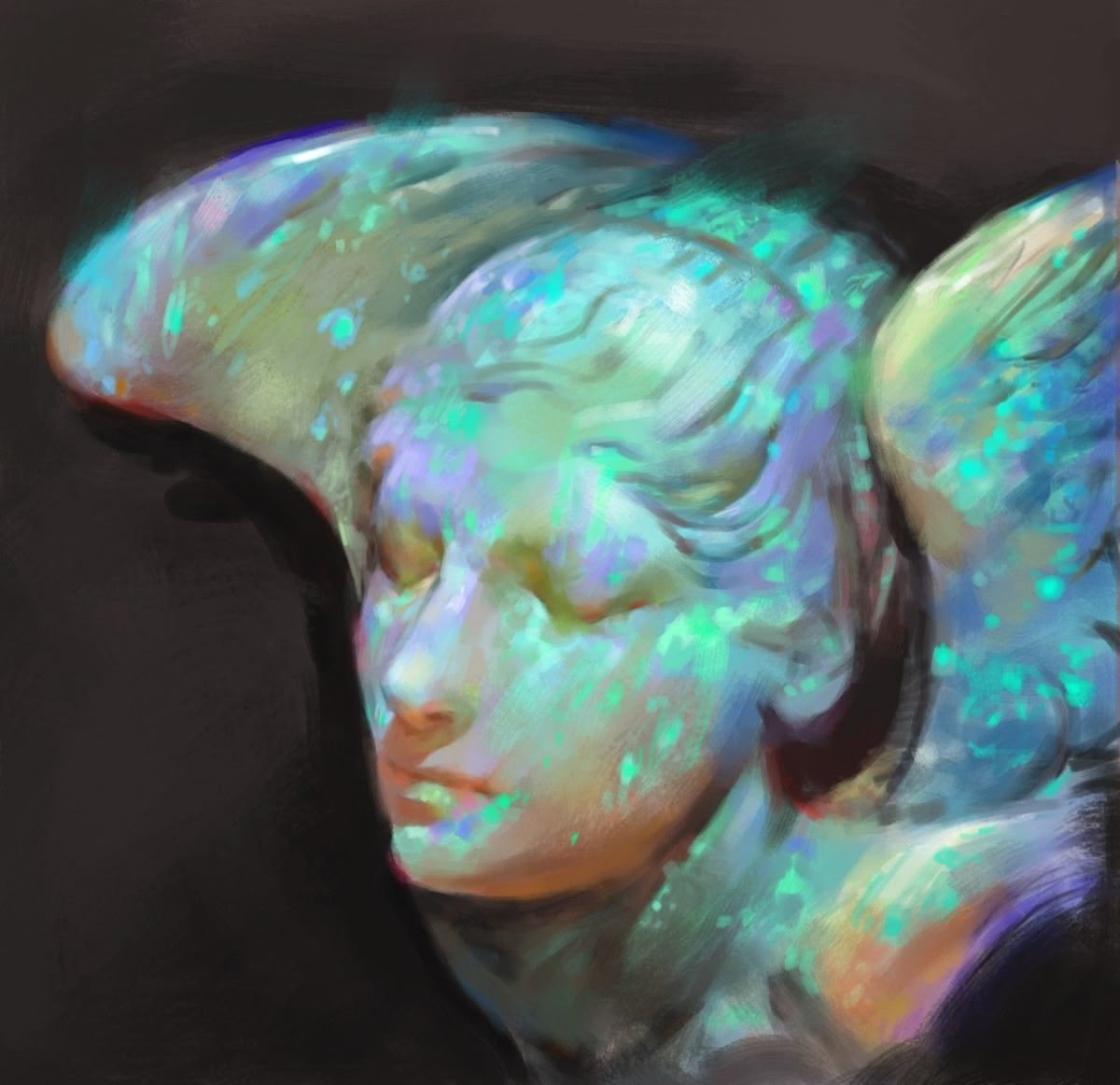 Бюст изображает молодую женщину, чьё лицо окутано таинственностью. Её черты словно рождаются из глубины камня, а игра опалесценции придаёт им неземное, эфирное качество. Глаза, кажется, смотрят сквозь время, а мягкие линии лица выражают покой и задумчивость. Создаётся ощущение, будто она – это само воплощение грёз, облако, которое вот-вот растворится, оставив после себя лишь мерцающий след.