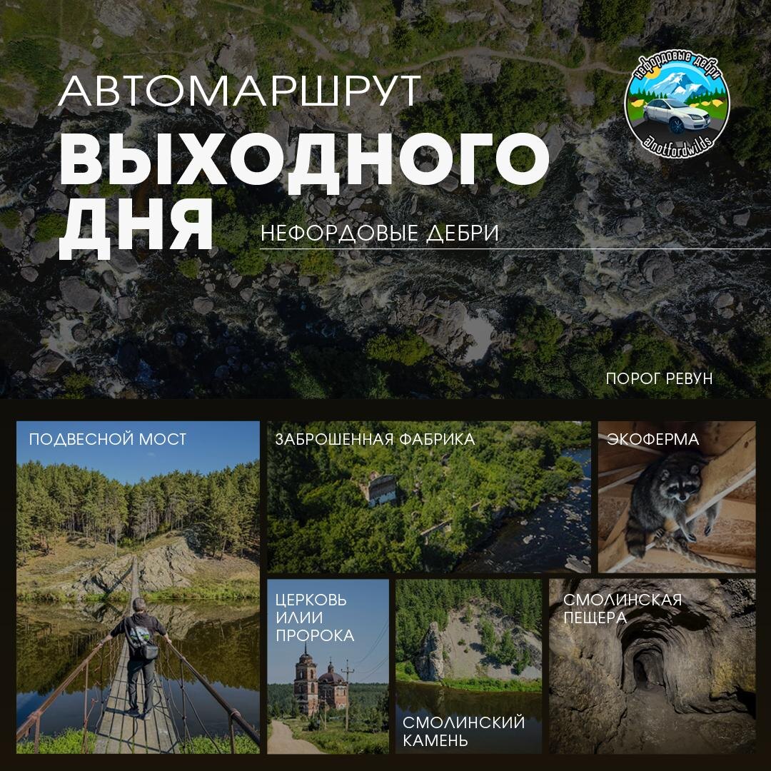 🚙 Автомаршрут выходного дня №1 Увлекательное путешествие, идеально подходящее для поездки с детьми и домашними питомцами по живописным местам. Подробные описания и координаты каждой локации доступны по ссылкам в отдельных постах. Вас ждет: 🇧🇼прогулка вдоль реки Исеть и знакомство с самым бурным порогом Свердловской области – Ревуном; 🇧🇼знакомство с милыми животными на экоферме «Славянское гнездо»; 🇧🇼исследование таинственной Смолинской пещеры, где вы почувствуйте себя спелеологом; 🇧🇼посещение заброшенной фабрики «Свободный труд» с её историческим шармом; 🇧🇼прикосновение к духовной красоте заброшенной церкви в селе Смолинском; 🇧🇼полюбуетесь живописным Смолинским камнем; 🇧🇼прогулка по старому подвесному мосту и сосновому бору. Маршрут можно адаптировать под ваши интересы и время. Вы сами выбираете, какие места посетить и в каком порядке. Уверен, каждый найдёт что-то интересное для себя! Делитесь своими впечатлениями и фотографиями после поездки! Поделись маршрутом с др