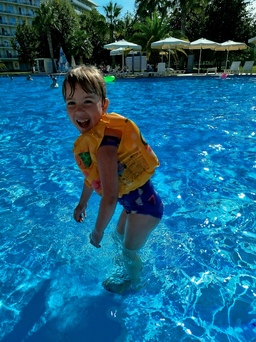 Всех приветствую. Начало тут Вот и подошел к концу мой отпуск. Погода на шестой день опять не радовала, по небу ходили тучки и был легкий ветерок. Мы с Сашей подумали и решили все ж рискнуть пойти плавать в тёплый бассейн. На улице было +20°, а в воде +28°. Входить в бассейн было приятно, пока мы в нем плескались, облачка стали разбегаться и появилось солнышко. А потом и вовсе как начало жарить, так что смотреть прогноз погоды в Сочи бесполезно, погода очень переменчивая. Плаваем мы в бассейне, смотрю у входа девочка плавает примерно Сашиного возраста тоже в желтом жилете и грустная такая. Обычно все дети под присмотром вместе со взрослыми, ну в крайнем случае мама наблюдает с края, а тут никого. Говорю Саше "поплыли, познакомимся". Девочку звали Маша, в бассейн она пришла с папой и он где-то плавает. Саша с Машей стали играть, прыгать с лесенки, показывали мне по очереди свои плюхи, мол, у кого громче. Смотрю Маша дрожит, спрашиваю "замерзла", говорит "да, хочу выйти". Стали искать