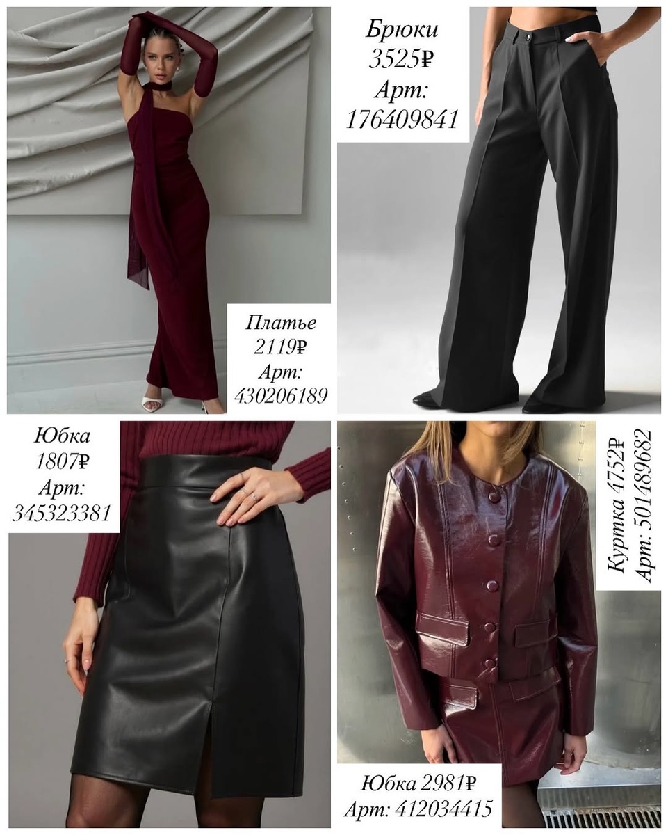 Глубокий бордовый, благородный блеск и строгая графика чёрного — идеальная формула осенне-зимних выходов и городских будней. Эта подборка собрана так, чтобы из пяти вещей легко сложились как эффектные вечерние комплекты, так и повседневные образы с характером. Идём строго по порядку артикулов и разбираем каждую находку до мелочей: посадка, фактура, сочетания и практичные подсказки стилиста.