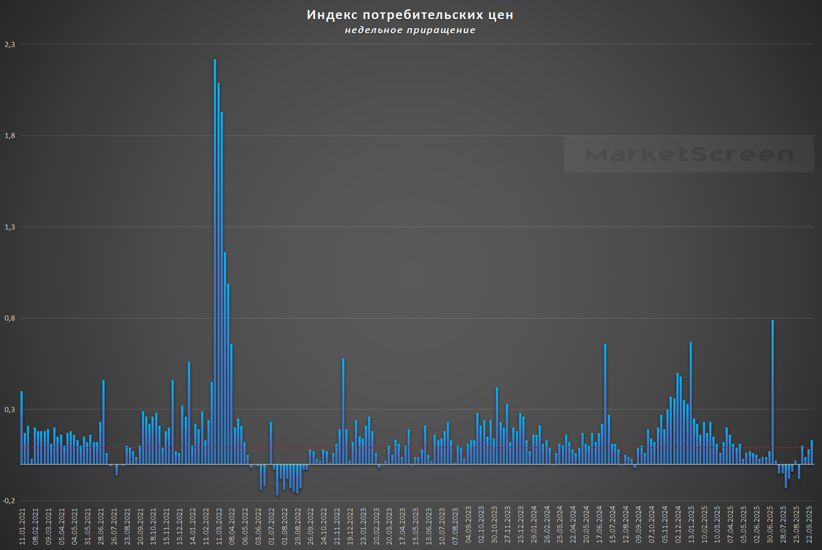 Ну вот и вышла недельная инфляция за свои целевые рамки. Таких значений мы не видели с апреля текущего года. При этом имеет место опережение показателей аналогичного периода в 2022 и 2023 годах. Но и, конечно, необходимо отметить, что сезонно осенью инфляция обычно имеет свойство расти. Впереди достаточно высокие показатели 2024, и если в оставшееся до конца года время инфляция их не обновит, то по году будет терпимо.