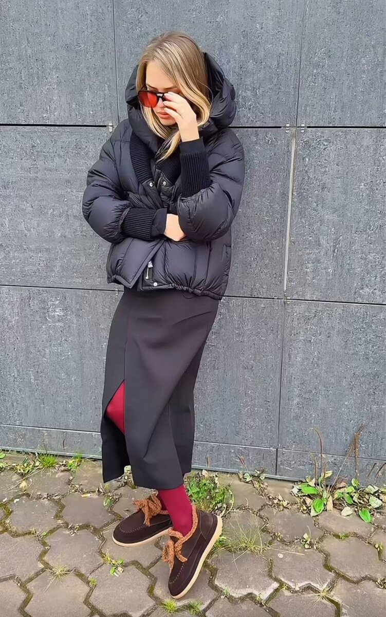 — Колготки бургунди — становятся колористическим акцентом, выходящим только в разрезе: тонкий намёк, благородный pop of color.( кто не готов, оставьте привычные черные для total black)