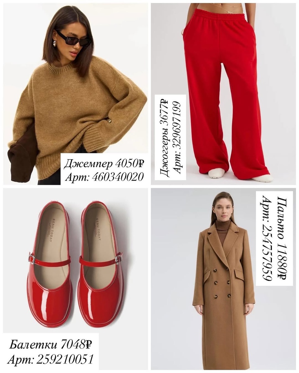 Четыре вещи — а вариантов много. Карамель отвечает за тепло и статус, красный — за энергию и настроение. Пальто выстраивает фигуру, джемпер даёт уютный объём, джоггеры добавляют динамики, балетки становятся акцентом. Меняя только обувь и верхний слой, вы легко переходите от делового дня к выходному и обратно.