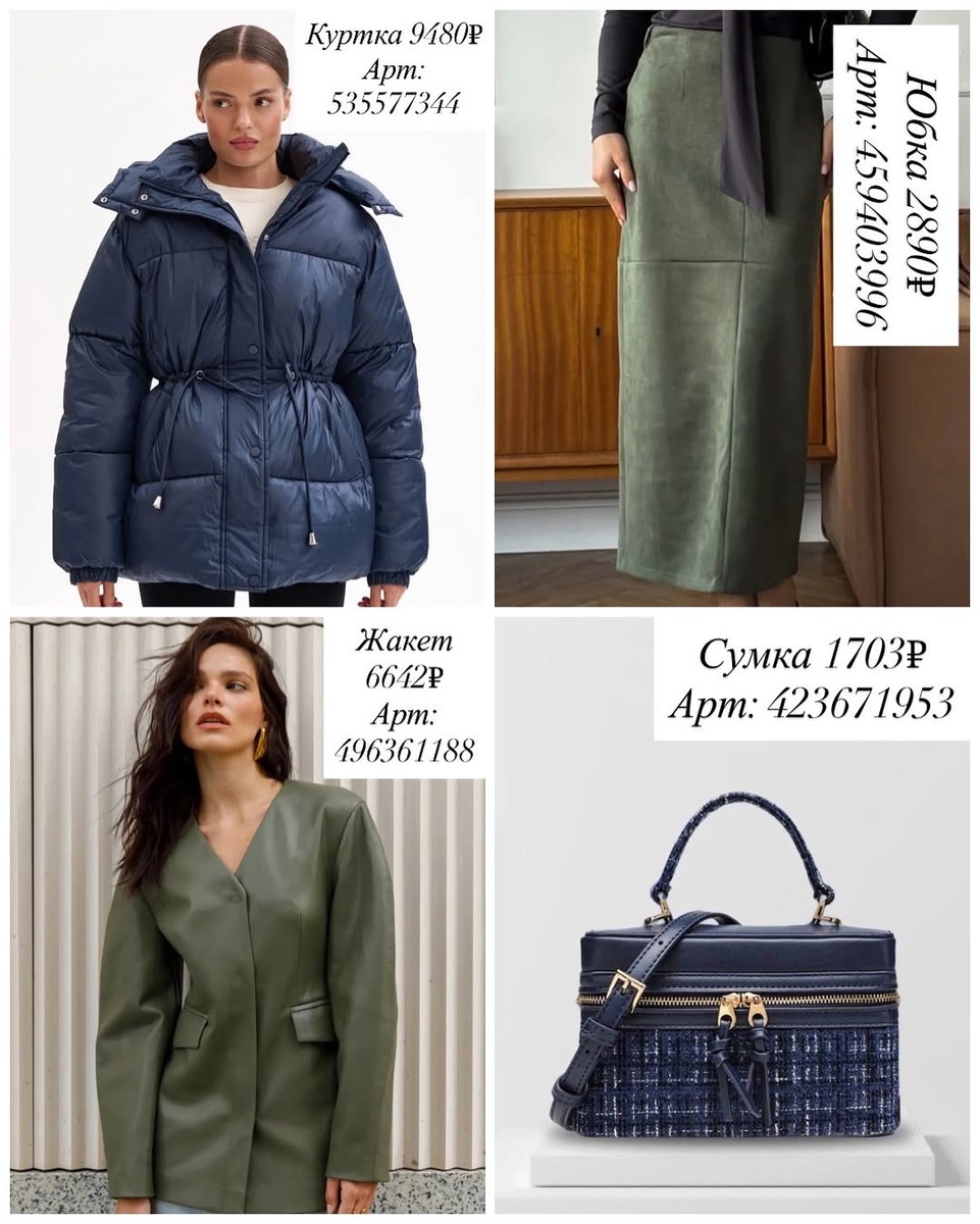 Глубокий синий и природный зелёный — союз, который всегда выглядит благородно и спокойно. Матовые и полуматовые фактуры, мягкие линии, удобные посадки — из этих вещей складывается капсула на каждый день: тёплая, практичная и при этом очень аккуратная. Ниже — подробный разбор каждой позиции строго по порядку артикулов, с описанием кроя, материалов, посадки и советами стилиста.
