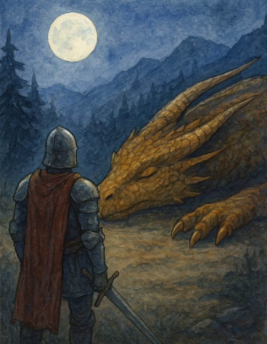 Рыцарь поднялся, потирая ушибленный локоть, и остолбенел. Перед ним лежал дракон. Драконов вблизи деревни Дерека не водилось, и он полагал, что эти ящеры размером с корову. Ну максимум с деревенский дом. То, что он увидел, могло сойти за холм. Или за небольшую гору. Дракон спал, выпуская пар из огромных ноздрей. Острые когти кинжалами вонзились в землю. Медная чешуя тускло поблескивала при свете полной луны. Дерек попятился. Мечта стать драконоборцем сдулась и улетела куда-то в район левой пятки. А затем случилось страшное. Дракон открыл янтарный глаз и посмотрел на Дерека.