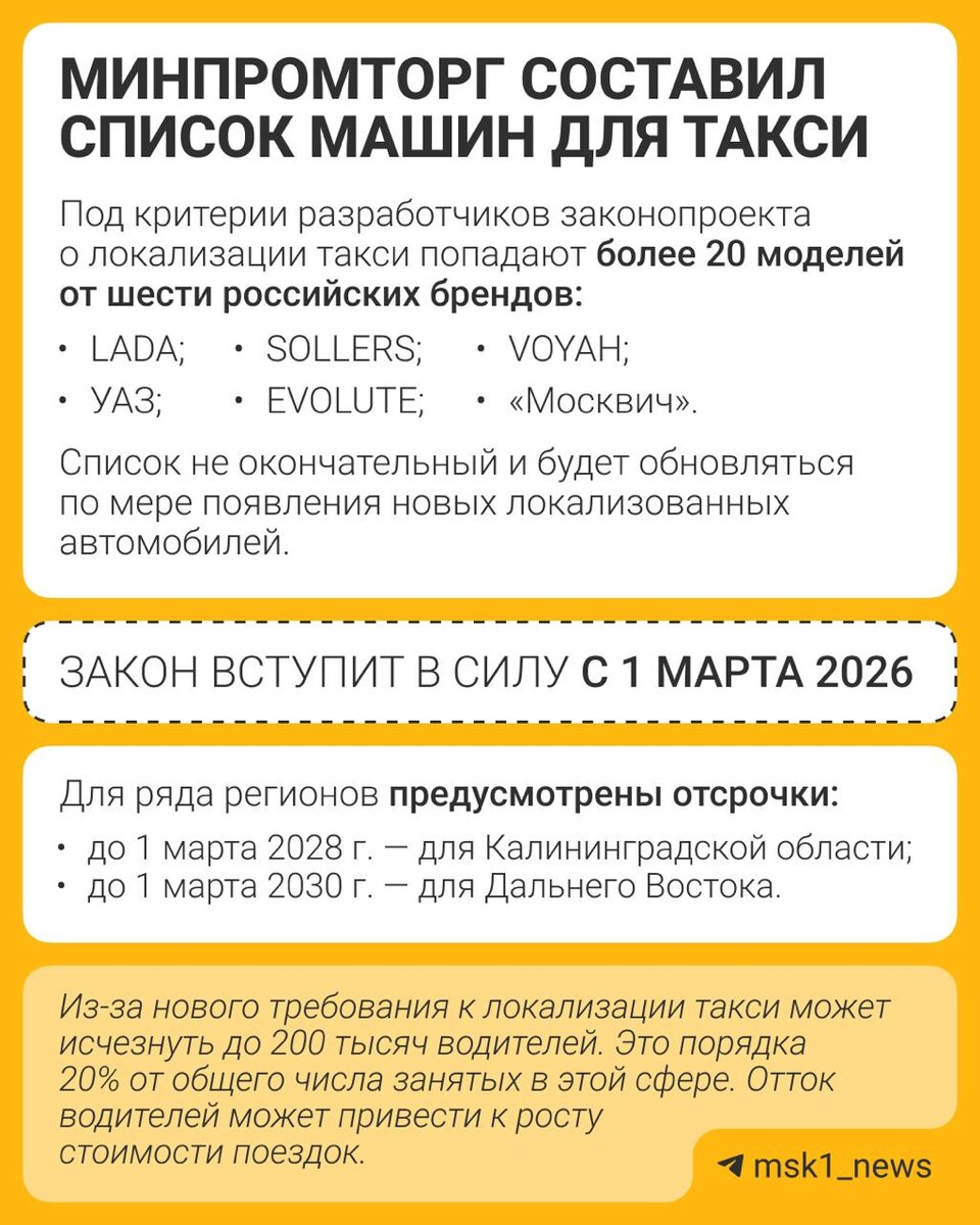 Прощаемся с иномарками в такси? Минпромторг составил список автомобилей для такси, которые соответствуют закону о локализации. Когда закон вступит в силу, на чем будем ездить и почему поездки могут подорожать⬆️ Как вам список? 👍🏻 — супер 🗿 — будет отлично, когда его немного расширят 😄 — пожалуй, пересяду на автобусы