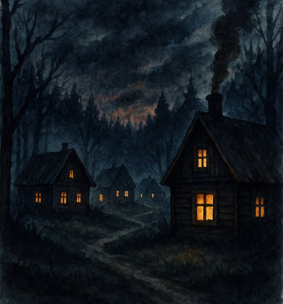 Девушка думала, что хозяева дома дожидаются их в горнице с печью, но там тоже никого не было. Тогда Ангелина собрала туристов и вывела их во двор. Рассветные лучи мягко ложились на крыши домов. На траве блестела роса. Где-то в лесу чирикали птицы, начала свой отсчёт кукушка. Над домами больше не вился дымок. Тёмные избы стояли мрачными тенями, во дворах колосилась высокая трава.