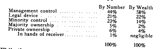 Учитывая эти различные виды юридического и фактического контроля, была предпринята попытка выяснить, насколько далеко каждый из этих типов существует среди крупнейших американских корпораций. Для этой цели список из двухсот крупнейших компаний был классифицирован в соответствии с типом контроля и степенью разделения собственности и контроля. В такой классификации неизбежно присутствует большая доля ошибок. Во многих случаях точная информация отсутствует, и результатом в лучшем случае являются выводы, сделанные на основе фрагментарных свидетельств. Во многих других случаях руководство самой корпорации было бы озадачено ответом на вопрос "Кто контролирует ситуацию?" Это особенно верно в отношении корпораций, находящихся под "совместным контролем". В этих случаях нередко несколько человек или групп людей занимают должности отчасти потому, что они владеют частью акций корпорации; отчасти благодаря своему личному влиянию; отчасти потому, что они связаны с учреждениями или интересами