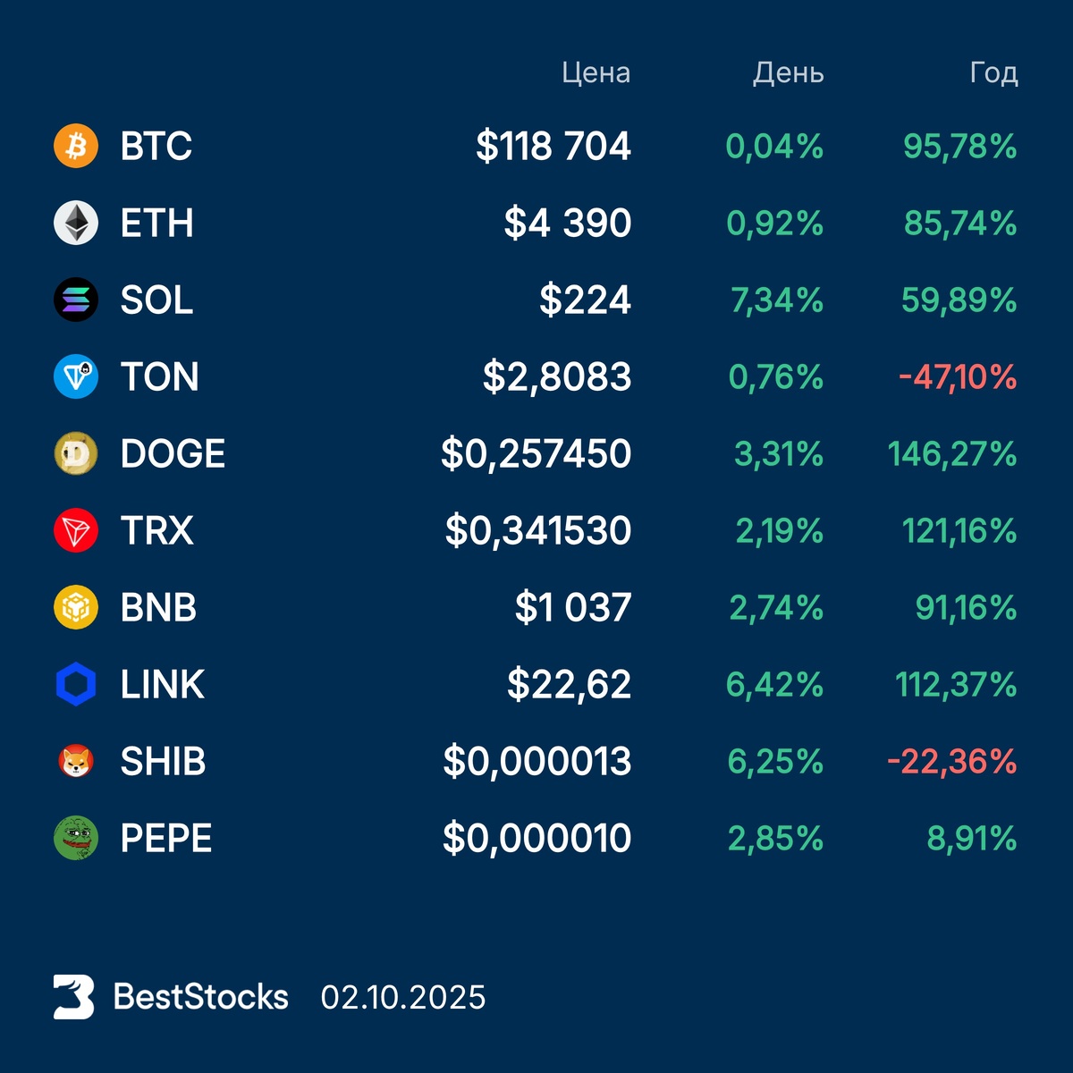 Курсы основных криптовалют: Bitcoin, Etherium, Solana, Toncoin, Dogecoin, TRON, BNB, Chainlink, Pepe, Shiba Inu на текущий момент #крипта #crypto #курс #BTC #ETH #SOL #TON #DOGE #TRX #BNB #LINKUSD #PEPEUSD #SHIBUSD ••••• ❓ Брокер перестал показывать стоимость портфеля? Это можно исправить — BestStocks сделал специальный бесплатный инструмент, который показывает стоимость всех акций в вашем портфеле в реальном времени. Попробовать бесплатно