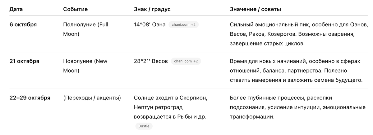 - В период новолуния (21 октября) — концентрируйтесь на целях, записывайте намерения, начинайте новое (даже небольшое). Особенно полезно в партнерских делах.