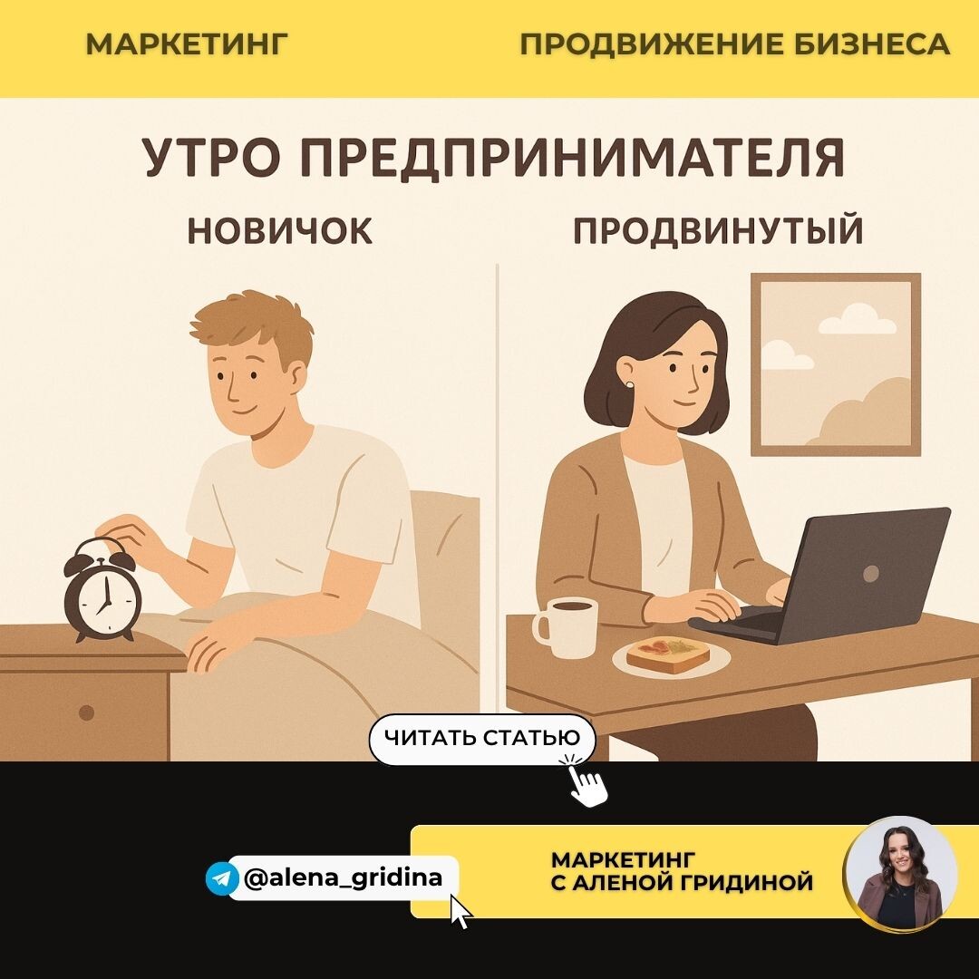 В бизнесе, как и в жизни, всегда есть этапы. И то, что кажется нормой на старте, через пару лет вызывает улыбку. Давайте посмотрим, чем отличается утро и привычки новичка и предпринимателя с опытом. Утро начинающего предпринимателя Будильник на 10–11 утра. В планах — полезный завтрак, вкусный кофе, спорт, чтение книг по бизнесу и пара вдохновляющих видео. У новичка всегда с собой красивый блокнот, где расписаны цели и стратегии: «Через 3 месяца сделаю Х», «Через год выйду на миллион». На этом этапе кажется, что главное — всё правильно спланировать, и бизнес пойдёт сам собой. Это этап энтузиазма и романтики бизнеса. Чистый лист, энергия, вера в лучшее. Утро продвинутого предпринимателя Здесь всё иначе: кофе «3 в 1», бутерброд на бегу, звонки с самого утра, и вместо спорта — переговоры. Телефон пищит от уведомлений, в ноутбуке 50 вкладок, а задач столько, что без приоритизации всё бы давно рухнуло. Опытный предприниматель думает о будущих планах — он сосредоточен на задачах, которые «на