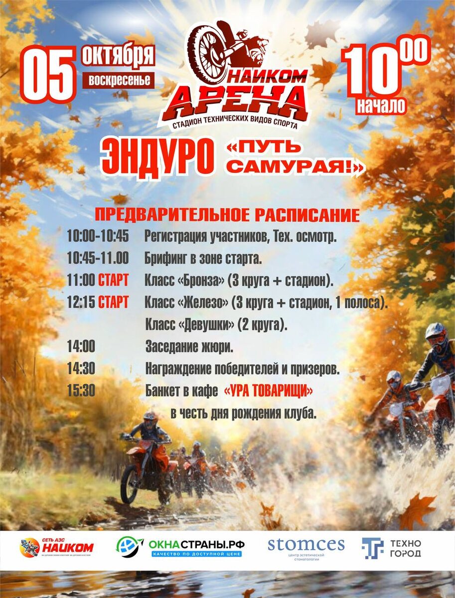 Предварительное расписание Эндуро-гонки «Путь Самурая» на стадионе НАИКОМ АРЕНА для участников клуба «Наиком Экстрим Мотокросс», которое состоится 5 октября 2025 г.! 🔥