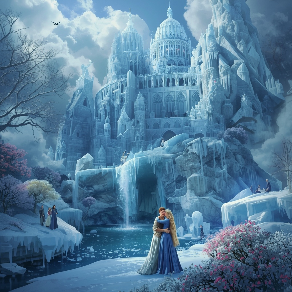 За стенами дворца происходило чудо. Из растаявшего льда прорастали цветы — не земные, а ледяные, кристаллические, но живые и прекрасные. Замороженные сады превращались в удивительные ландшафты, где лёд и жизнь существовали в гармонии.