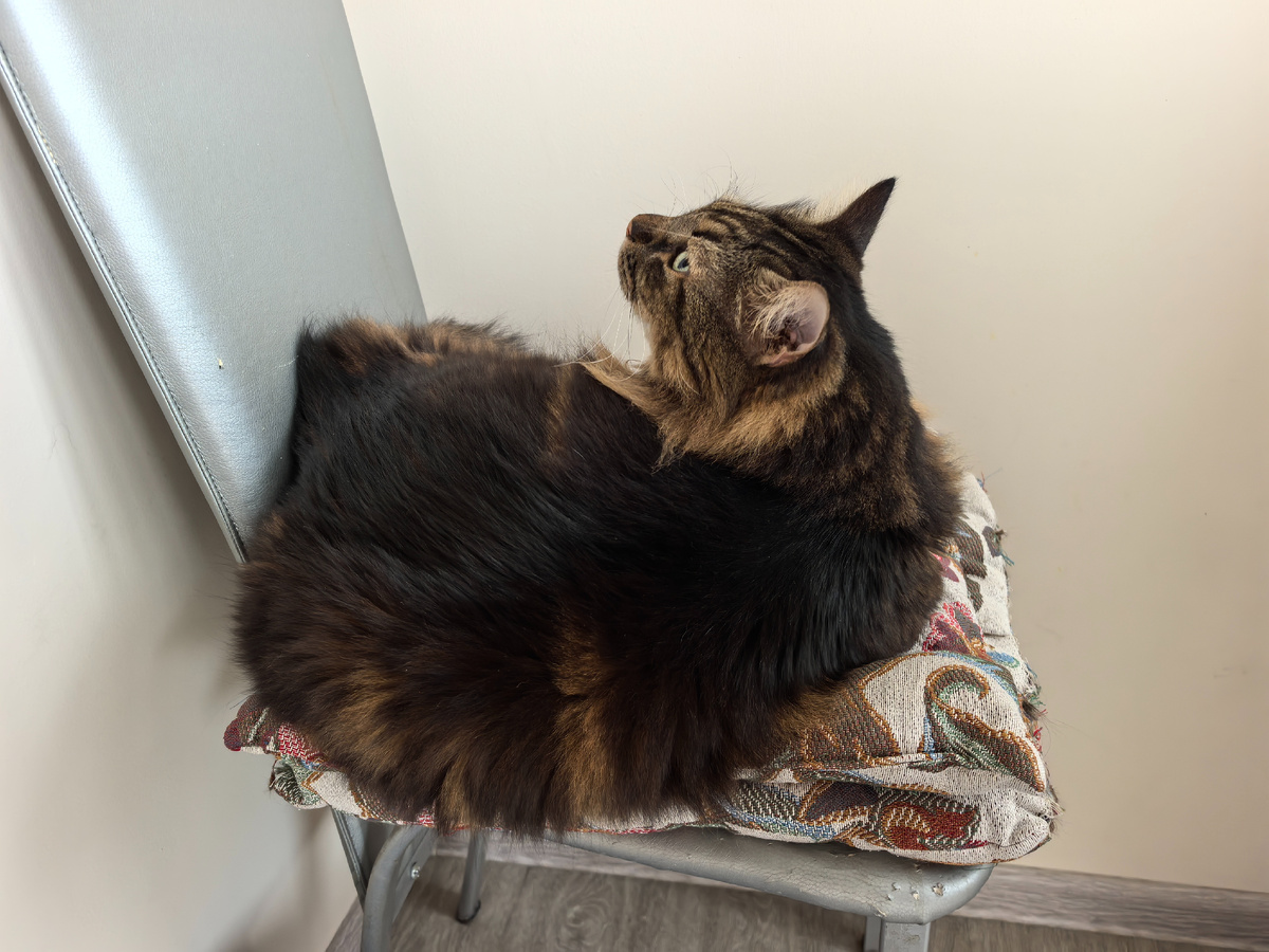 Всем привет! С вами Кузя Кусалочкин (он же царь Кузьма I). Сегодня буду вспоминать, как я появился у своих никчемней. Утро началось стандартно. Я начал с утра пораньше будить хозяйку. Но, как вы уже выучили, встаёт она только по будильнику. На новые каналы я сейчас не подписываюсь. Дружить, забежать в гости времени нет. Вместе с хозяйкой мы пошли на кухню, я получил свой паштетик на царской тарелке. Ночью пошёл сильный дождь и налил нам на балкон (потому что окна не закрываем). Хозяйка всё это убирала. Ну а я проводил хозяина и ушёл спать на балкон. Я теперь часто сплю на этом стуле: А вот хозяйка говорит, что это странно и уже холодно спать на балконе, особенно ночью. Спал себе спокойно, и тут как сирены включат. Хорошо, что хозяйка рядом в тот момент была. Сказала, что это просто проверка. А я уже успел немного испугаться. И вот интересно, зачем у нас такие проверки проводить, если их периодически включают и понятно, что всё работает. Погода у нас опять была сонной. Дождь то шёл,