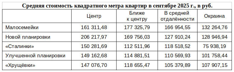 Самые недорогие квартиры - на окраинах, прежде всего в двухэтажных деревянных сталинках с удобствами во дворе. Средняя цена за такое жилье в сентябре - 3 миллиона 300 тысяч рублей. Но еще дешевле были малосемейки на окраинах и, что интересно, в центре города (до 1 миллиона 300 тысяч рублей).