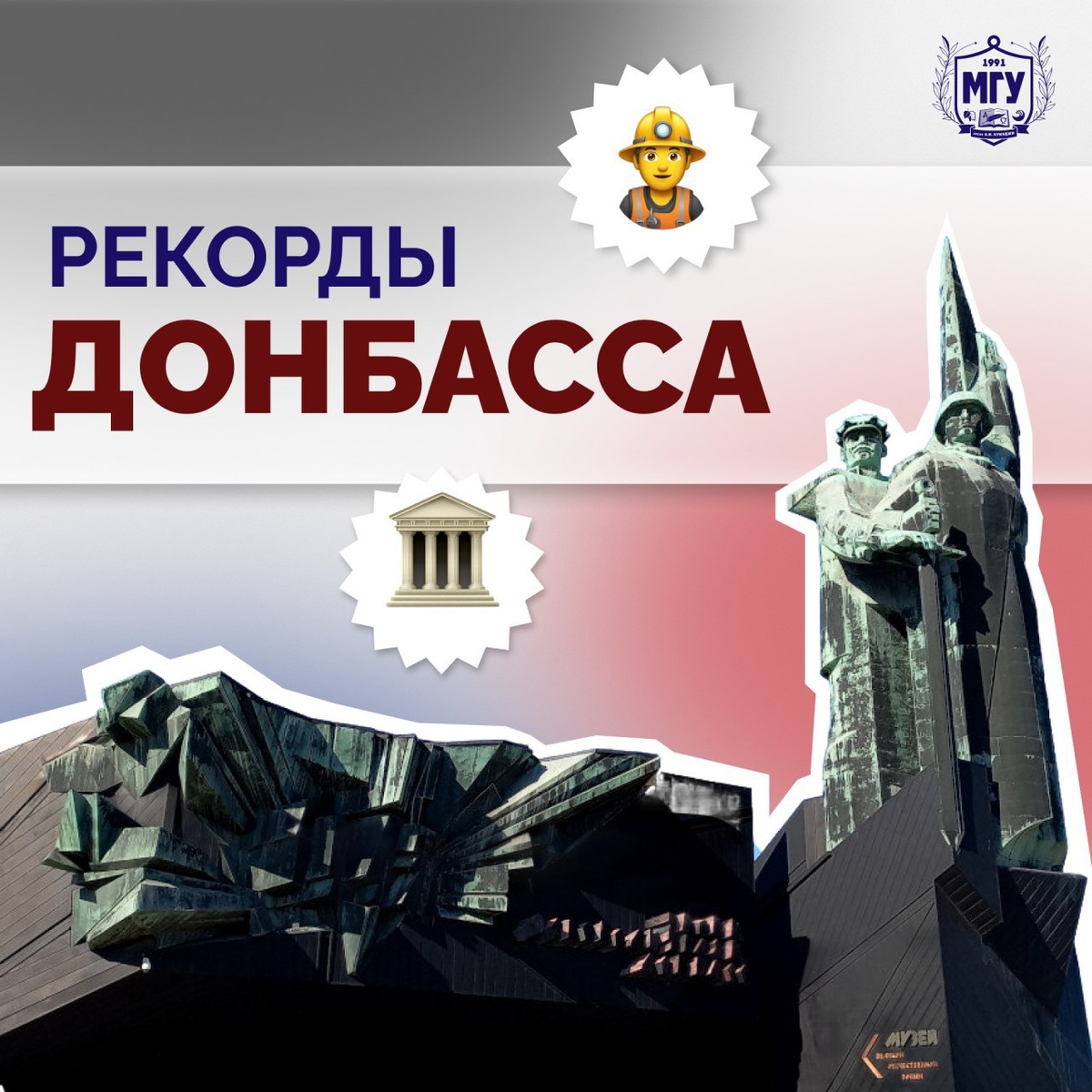 📚 #рекорды_Донбасса Памятник «Твоим освободителям, Донбасс» — монумент в Донецке, посвященный героям Великой Отечественной войны, который является олицетворением военной истории города и Республики. Монумент располагается в парке Ленинского комсомола в Донецке. Его торжественное открытие состоялось 8 мая 1984 года. В центре монумента на площадке треугольной формы величественно стоят фигуры шахтёра и солдата, держащие вместе меч. Общая высота данного памятника более 30 метров, у подножия которого зажжён Вечный огонь. Этот монумент хранит память о героях, которые жертвовали собой ради свободы Донбасса — и в годы Великой Отечественной войны, и сегодня. #МГУимениКуинджи