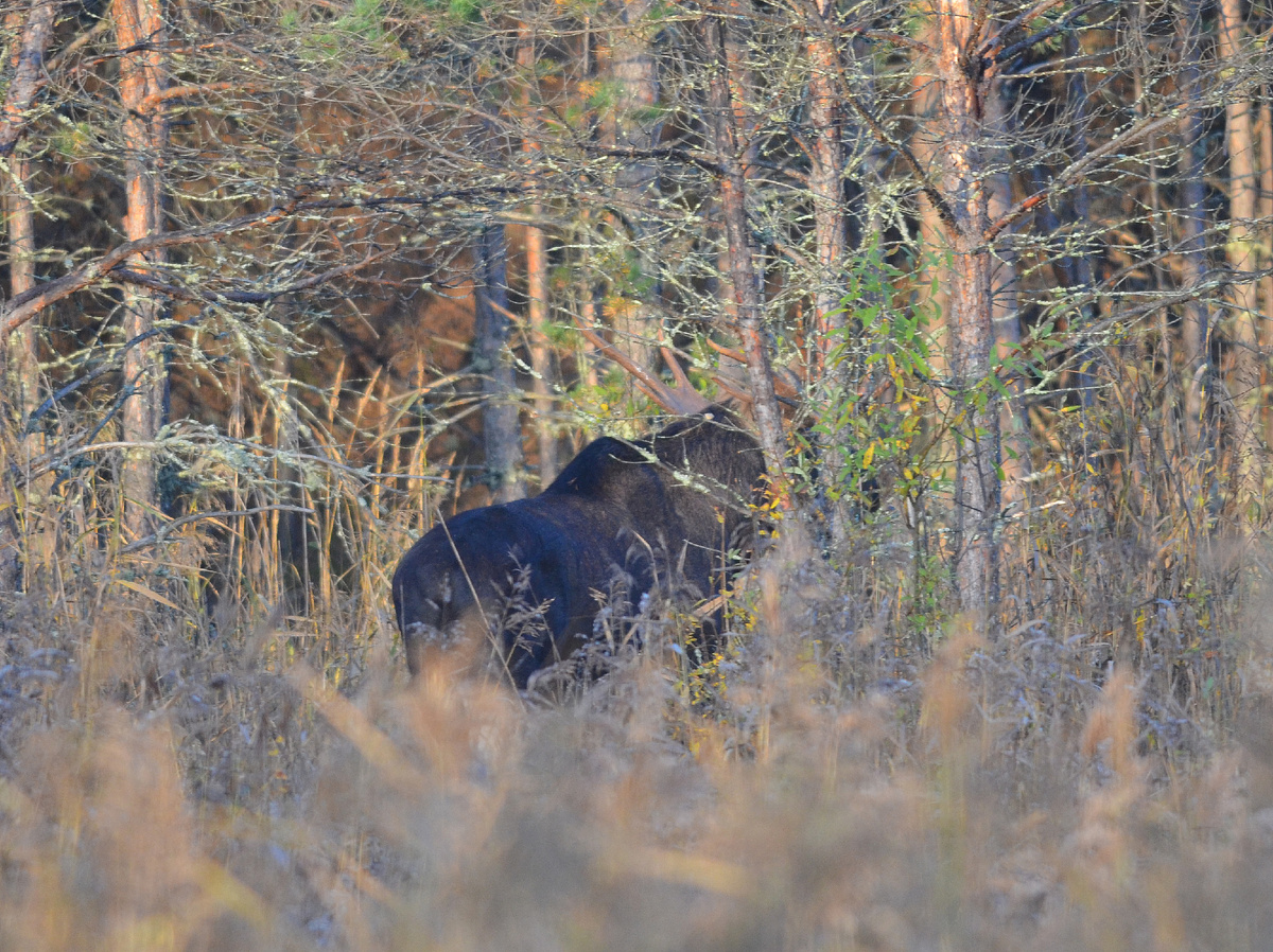 Даже не шумнув, я смог подойти близко к твердому берегу и увидеть лосей. Сам я для них остался незамеченным. Как только мне их стало видно сохатых, я прилег на ближайшую кочку. И пусть картинка была прерывиста из-за стволов впереди, я не рискнул пройти ближе, чтобы не спугнуть влюбленных. К тому же бинокль – неотъемлемая часть моего ежедневного снаряжения.