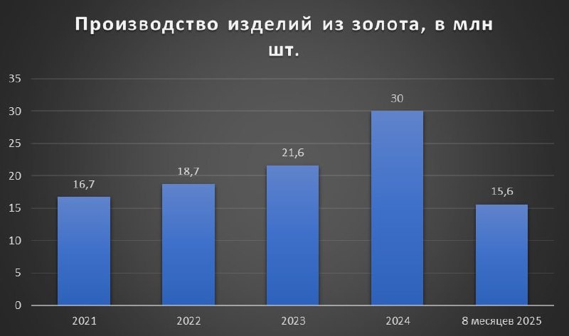 Рост производства ювелирных изделий из золота в 2025 году остановился. За восемь месяцев 2025 года было произведено 15,6 млн золотых украшений, что на 21% меньше, чем в 2024 году. По итогам года, по оценкам экспертов, объем изготовленной продукции из золота не превысит 23 млн штук, что соответствует уровню 2023 года.