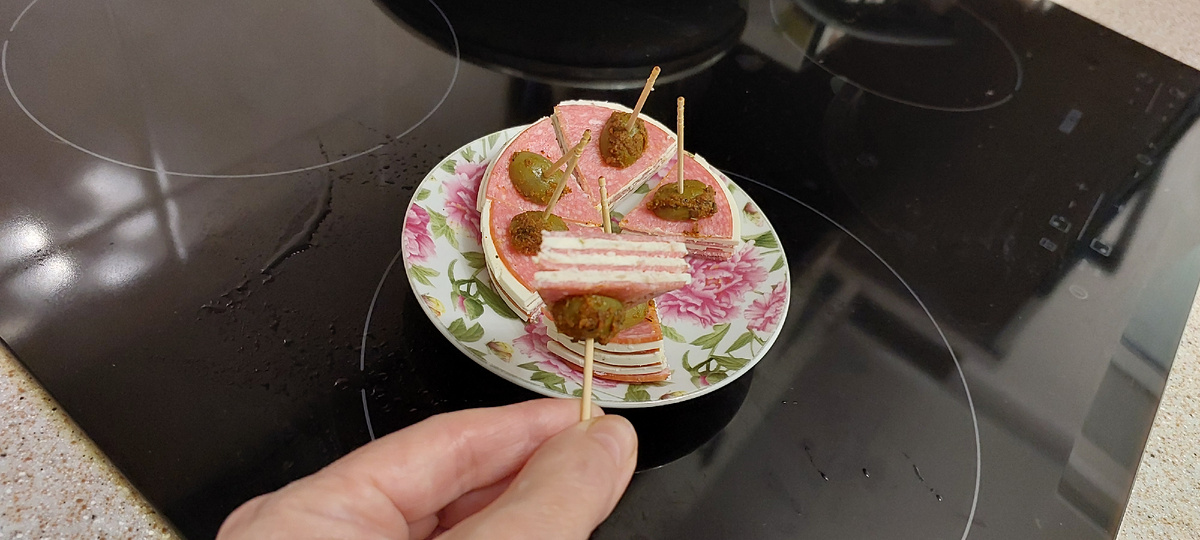 Количество слоев выбираем на свое усмотрение. Сверху кладем половинки оливок и скрепляем все слои зубочистками, протыкая насквозь оливку и каждый слой.