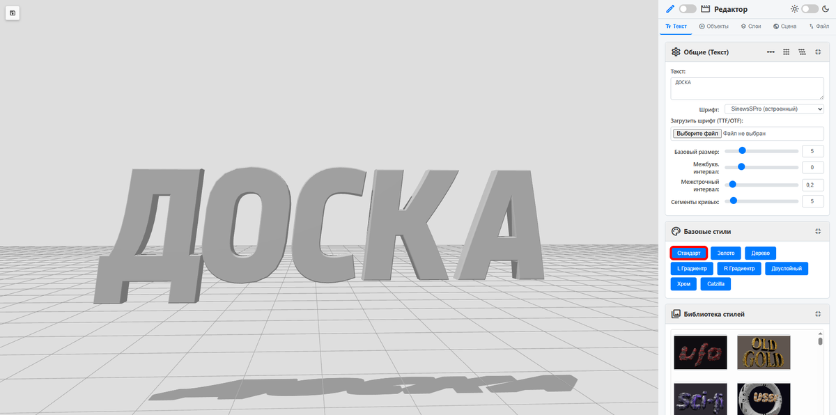 Начинать создавать будем с базового 3д текста без предустановленных стилей и эффектов, выбираем в списке базовых стилей Стандарт Настраиваем параметры и загружаем текстуры для текстового слоя. Переходим на вкладку слой, открываем параметры слоя нажатием на шестеренку. На вкладе слой ищем раздел Заливка и выбираем тип Картинка/Видео Загружаем подготовленные текстуры, в примере будем использовать текстуру деревянной доски и карты нормалей и шероховатости для создания эффекта реалистичности и глубины.