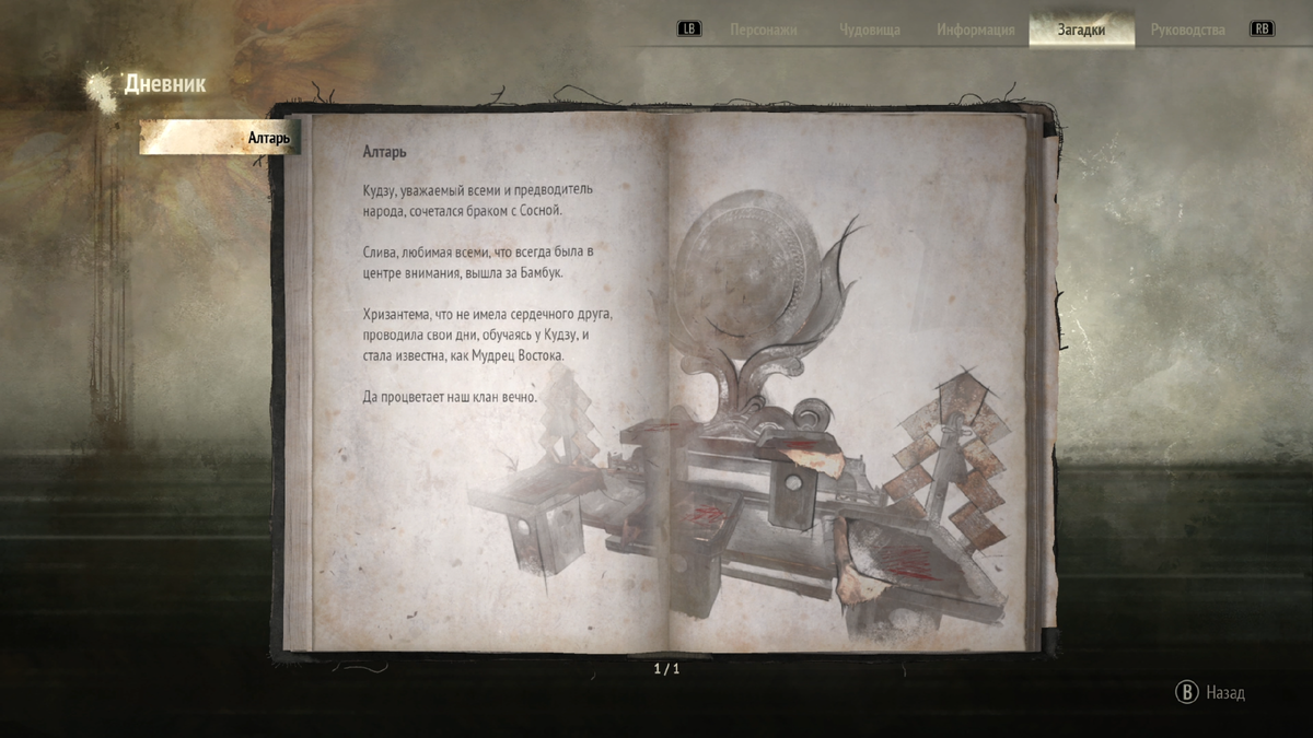 Всем привет решил написать небольшой пост по Сайлент Хиллу Ф, а именно по решению головоломок на сложности ЗАТЕРЯННЫЙ В ТУМАНЕ АЛТАРЬ Кудзу, уважаемый всеми и предводитель народа, сочетался браком с Сосной Слива, любимая всеми, что всегда была в центре внимания, вышла за Бамбук Хризантема, что не имела сердечного друга, проводила свои дни, обучаясь у Кудзу, и стала известна, как Мудрец Востока. Да процветает наш клан вечно. 1. Кудзу - это группа вьющихся, ползучих и стелющихся листопадных многолетних лиан. 2. Сосна - важное дерево в японской культуре, которое имеет символическое значение, используется в быту и ландшафтном дизайне. 3. Слива - растение семейства Розовые, вид из секции Абрикос рода Слива. 4. Бамбук - это разнообразная группа преимущественно вечнозелёный многолетних цветковых растений. 5. Хризантема - национальный символ Японии, который имеет особое значение в культуре страны. Головоломка сильно отличнается, на других сложностях она легко проходиться, а на затерянном т