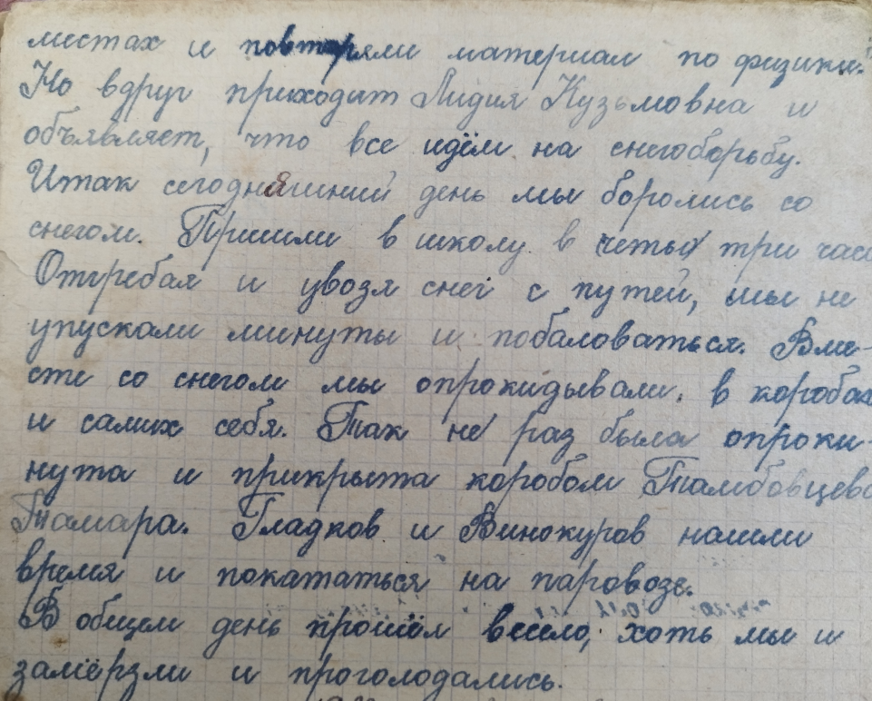 Судя по дневниковой записи от 24 декабря 1944 года, вследствие работы школьников в будни на снегоборьбе. уроки ребят переносились на выходные дни: «…сегодня, несмотря на то, что выходной день, мы занимались, так как в один из учебных дней мы ходили на воскресник, т.е. на снегоборьбу…».