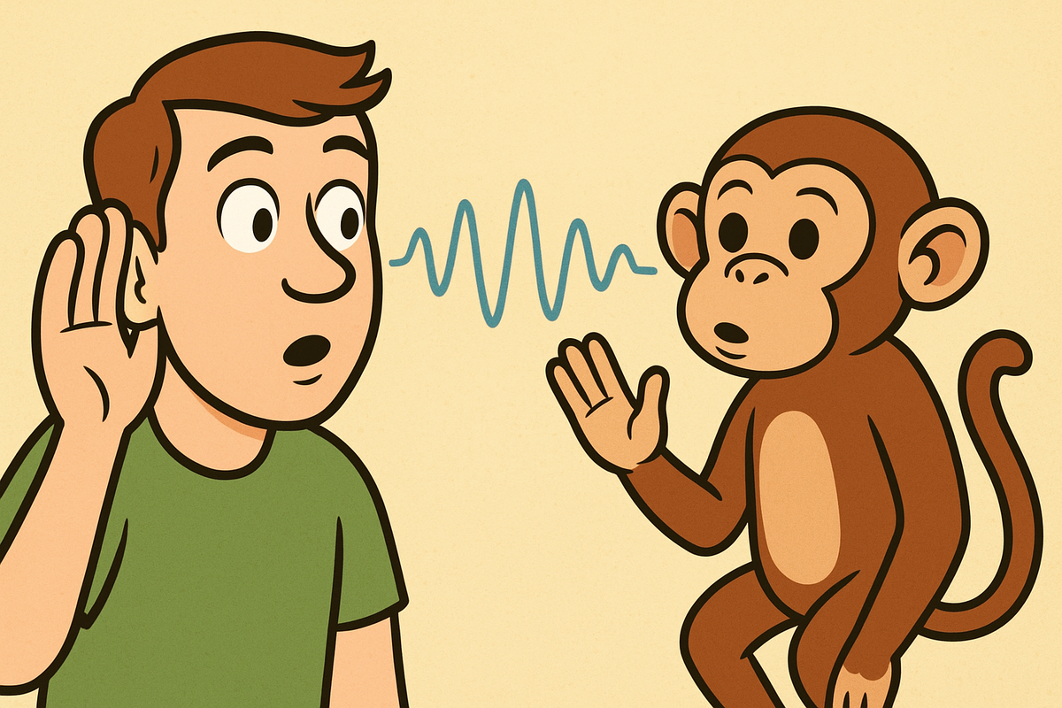 В тропических лесах Демократической Республики Конго учёная Мелисса Берте наблюдала за бонобо. За полгода она записала 700 криков от 30 взрослых особей и обнаружила, что обезьяны могут сочетают отдельные крики в сложное подобие фраз, смысл которых складывается из частей. И тут важно отметить, что учёные, конечно же, не знают о чём думает животное наверняка. Но вот выявить закономерности можно: · Скажем, характерный звук Х часто звучит во время ситуации Y, наверное, вероятно звук связан с ситуацией. · Если звучит комбинация звуков, и животное реагирует иначе, то это сочетание несёт новый смысл. Например, у бонобо было замечено следующее: крик «посмотри на меня» + крик «давай сделаем это» = «посмотри, что я делаю, и присоединяйся». И действительно, когда звучали эти два крика, обезьяны собирались, чтобы выполнить что-то вместе. Это свойство называется композициональность – способность объединять элементы со смыслом в новые выражения. И, по всей видимости, так умеют не только люди. Пом