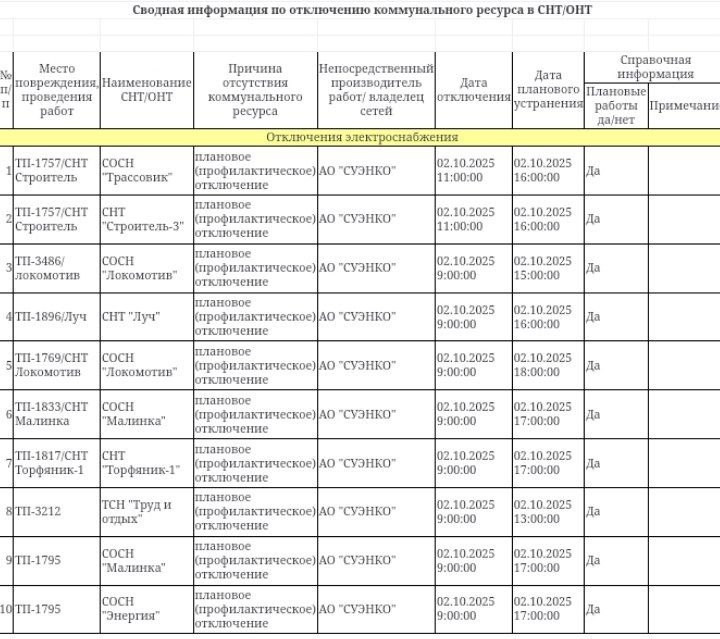 Информация по плановым отключениям в СНТ/ДНТ на 02.10.2025 от ЕДДС города Тюмени