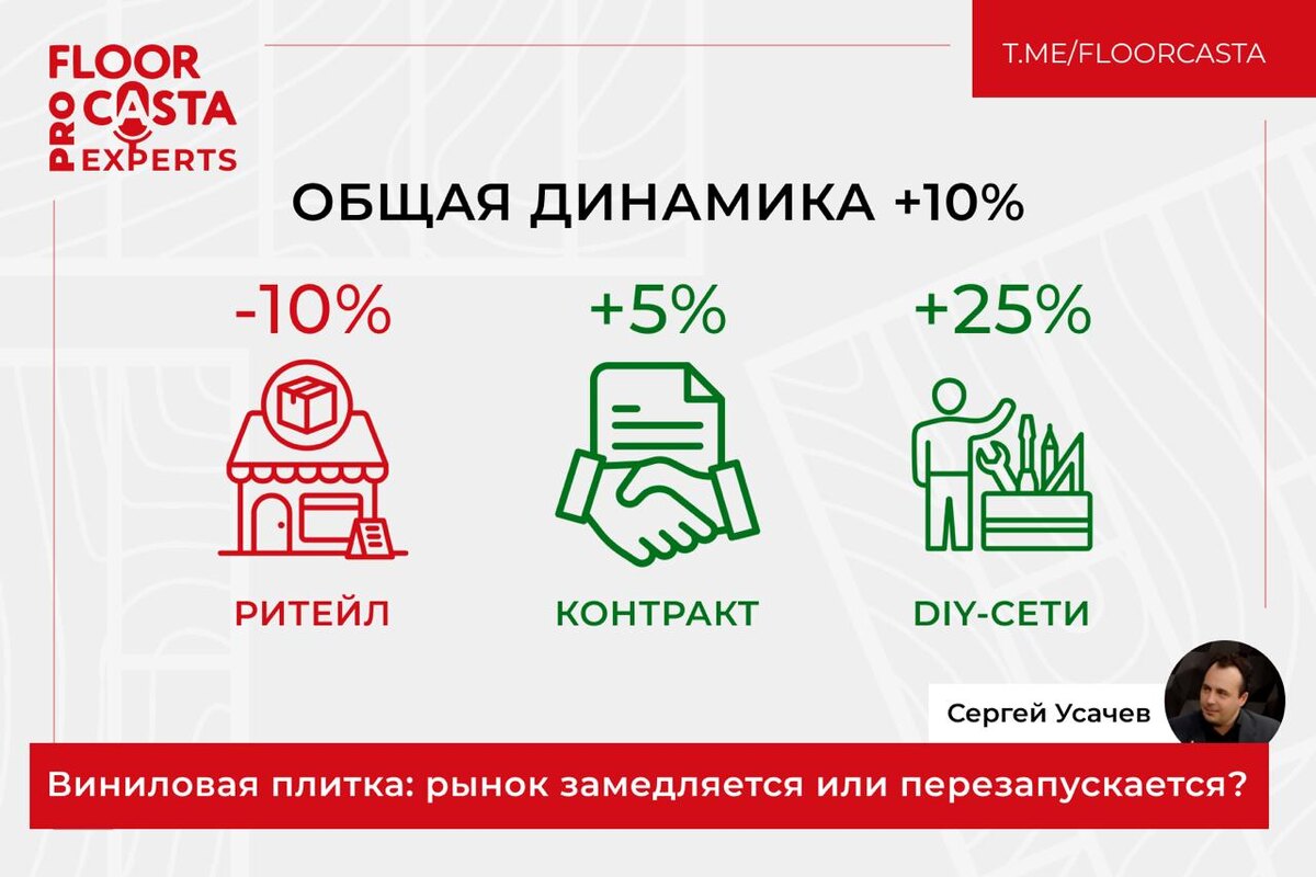Виниловая плитка: рынок замедляется или перезапускается? Летний ажиотаж позади, и мы видим интересный тренд: общие продажи виниловой плитки демонстрируют рост, но сам рынок проходит этап серьезной структурной перестройки. Если смотреть на цифры, рынок в целом показывает +10%. Однако за этой позитивной цифрой скрывается три разных истории: 🔘Ритейл: -10% Классический ритейл столкнулся с замедлением. Потребитель стал более сдержанным, и продажи в этом канале опускаются ниже уровня прошлого года. 🔘Контрактные продажи: +5% Пока скромный, но очень стабильный рост. Этот канал только просыпается и готовится показать себя. 🔘DIY-сети: +25% А вот здесь — взрывной рост! Крупные сети, такие как ЛЕМАНА ПРО и ПЕТРОВИЧ, значительно расширили ассортимент на полках, что дало немедленный эффект. DIY — новый локомотив роста. Рынок временно сместился в сторону гипермаркетов, где покупатель находит широкий выбор и может купить все для ремонта «в одном месте». Ритейл вынужден пересматривать стратеги