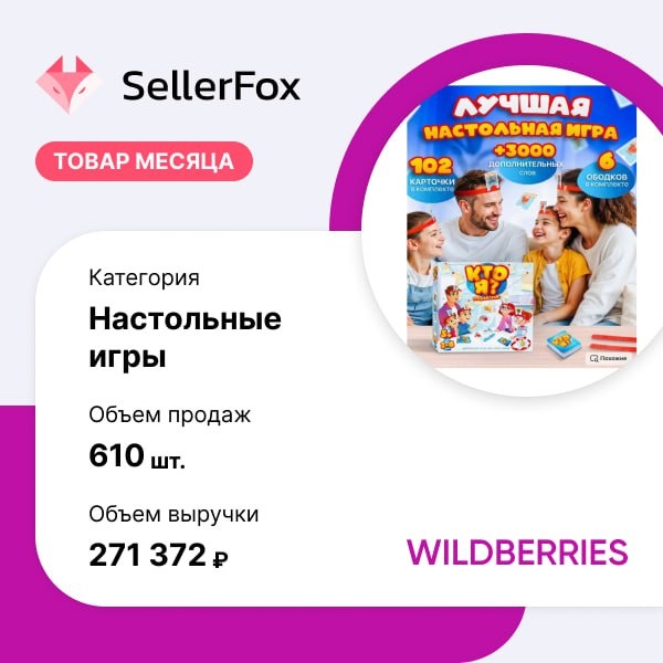 В кругу семьи. Настолка «Кто я» стала лидером по количеству продаж в категории «Настольные игры» на Wildberries. За последние 30 дней товар приобрели почти 600 раз на общую сумму свыше 270 тысяч рублей. В целом, по данным Wildberries, за полгода оборот настольных игр на площадке увеличился на треть по сравнению с первым полугодием 2024 года. Высокие темпы роста объясняются значительным расширением ассортимента настольных игр — количество артикулов выросло на 60%. При этом средний чек вырос незначительно — на 4%. В лидерах по обороту — магнитные варианты «Морского боя», игры для компаний «Что за мем?» и «Вонючий носок», детективные настолки, игра «Скажи, если сможешь». В топ-20 игр на Wildberries также вошли «Монополия», лото с бочонками и игра для взрослых «Войди аккуратно». Немного опустились в рейтинге UNO и Имаджинариум. В числе популярных настолок для опытных игроков — довольно сложная игра «Каркассон». В Wildberries отметили, что в 2025 году также сохраняют популярность настол