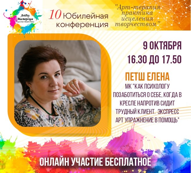🎨 МК "Как психологу позаботиться о себе, когда в кресле напротив сидит трудный клиент. Экспресс арт упражнение в помощь" В первой части мастер – класса рассмотрим ситуацию встречи психолога с трудным клиентом. Во второй части познакомимся с технологией оперативной арт помощи себе. Время: 9 октября 16.30 - 17.50 ⭐️Спикер: Елена Петш Психолог-консультант, преподаватель института практической психологии «Иматон» ✨ Участие бесплатное!!! Ссылка на регистрацию https://forms.yandex.ru/u/68adf277493639046ec1bc1b 🌸Также вы можете приобрести записи по ссылке https://artpsy.top/kh-yubilyeynuyu-konferentsiyu-art-terapiya-praktika-istseleniya-tvorchestvom Будем рады вас видеть⭐️