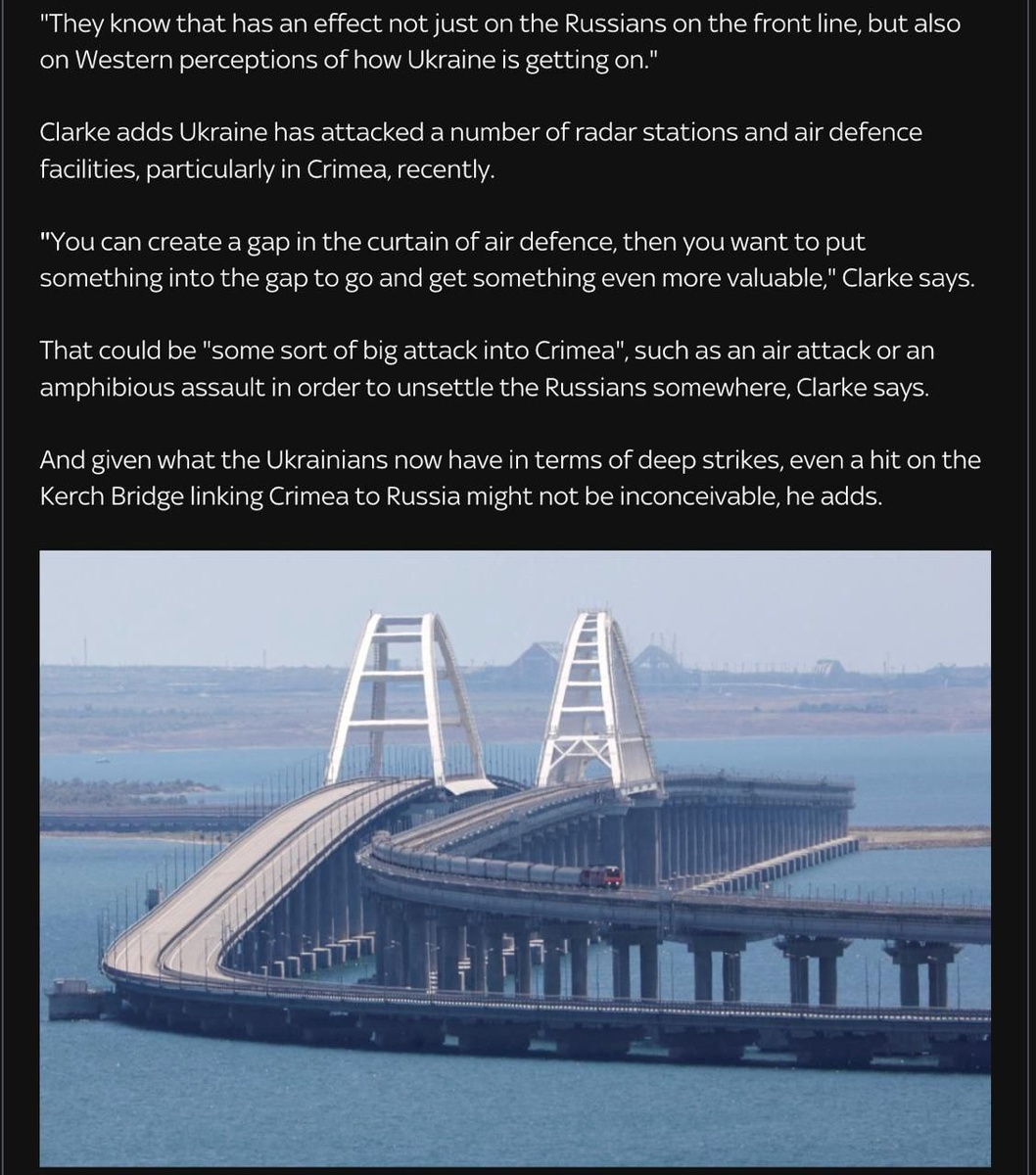 Военный эксперт Майкл Кларк в эфире Sky News заявил, что Украина теоретически может предпринять крупную операцию против Крыма — например попытаться высадить десант на полуостров или нанести удар по Керченскому мосту.