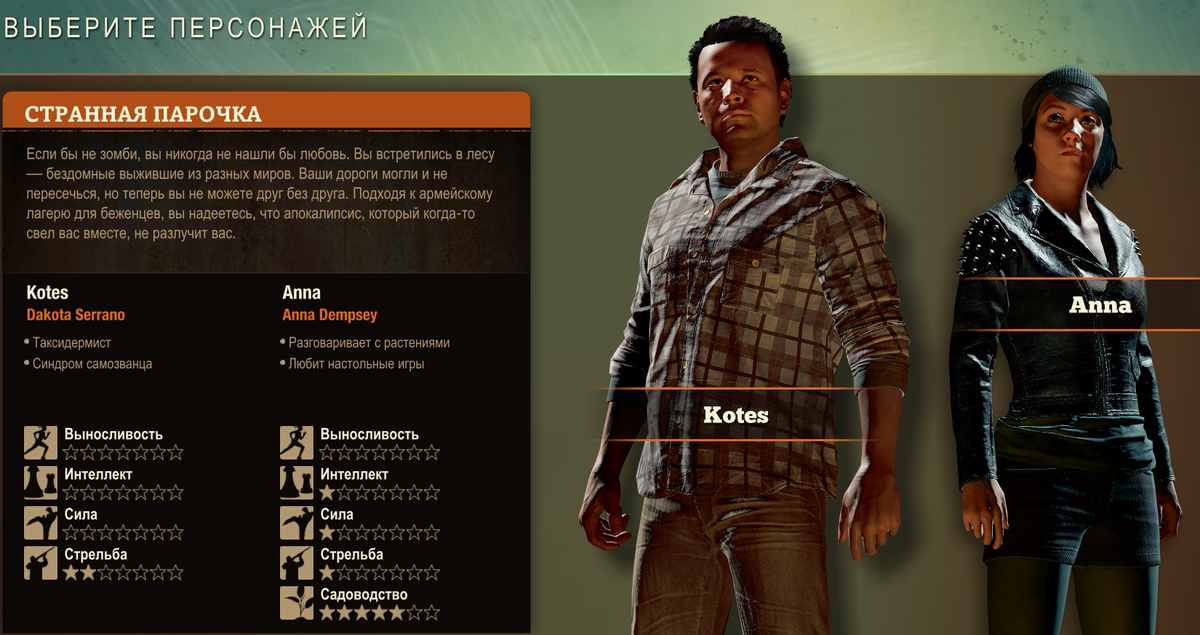 Это без преувеличения самый сильный и прощающий ошибки старт в игре. Котс познакомился с Анной уже после апокалипсиса где-то в лесу. Они понравились друг другу, поэтому на закате цивилизации между ними вспыхнули чувства. У Анны прокачано садоводство — а это крайне полезный навык, так как большинство игроков сталкиваются с проблемами недостатка еды и медикаментов. На ранних стадиях огород может покрыть нужды не самого притязательного сообщества и поспособствует вашей концентрации на других приоритетах.