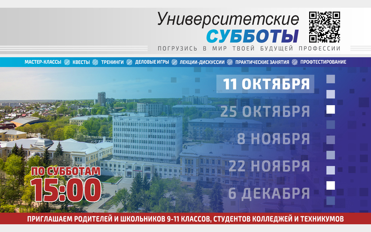 Пензенский государственный университет приглашает школьников 8–11 классов, выпускников техникумов и колледжей на «Университетские субботы». В новом учебном году они стартуют 11 октября. Гости смогут посетить мастер-классы, тренинги, деловые игры, практические занятия, лекции-дискуссии, конкурсы, консультации и встречи с работодателями. Мероприятие позволит погрузиться в профессию и поможет в формировании профессионального самоопределения. Место встречи гостей: 7-й учебный корпус, фойе, 14:00 (г. Пенза, ул. Красная 40). В 14:00 любой желающий сможет пройти профориентационное тестирование: «Какая профессия мне подходит? Кем мне стать?», а также поучаствовать в консультации для родителей «Куда идти учиться: ответы на трудные вопросы?» (консультацию проводят преподаватели кафедры «Общая психология» ПГУ). В 15:00 начнутся мероприятия, заявленные в программе. Военный учебный центр