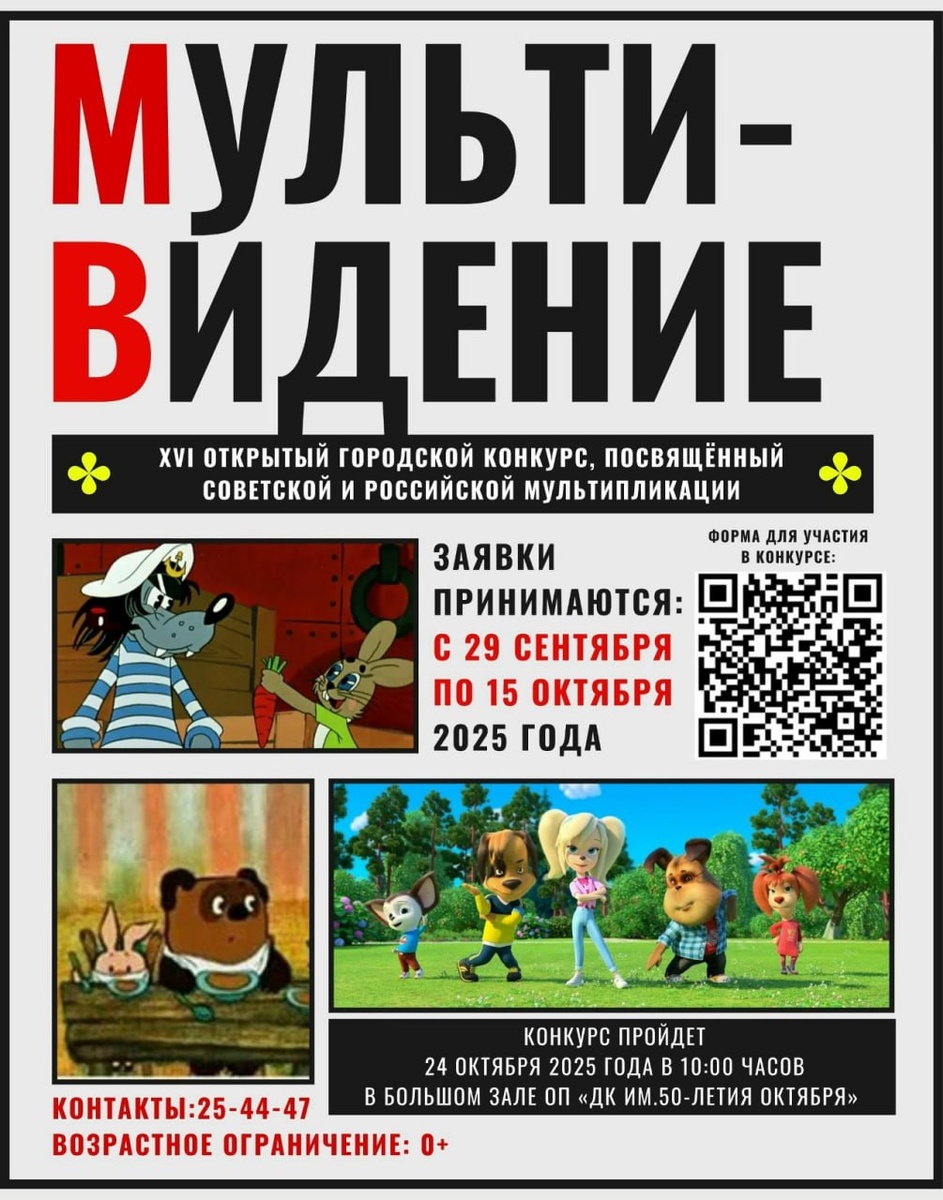 Талантливых ребят Кемерова приглашают принять участие в городском конкурсе «Мульти - видение», посвященном советской и российской мультипликации Свои таланты и любовь к отечественным мультфильмам конкурсантам предлагают продемонстрировать в номинациях: ✅«Мульт-арт» - изобразительное творчество; ✅«Мульт по-нашему» - мультипликация; ✅«Мульт-Победа» - мультипликация на тему Великой Отечественной войны; ✅«Мульт-айс» - оригинальный жанр; ✅«Мульт-танец» - хореография; ✅«Мульт-голос»-вокал; ✅«Мульт-исток»-театральное творчество. Принять участие могут коллективы и отдельные исполнители от 5 до 18 лет. Заявки на конкурс можно отправлять по 15 октября включительно по ссылке на яндекс-форму. Смотр конкурсных работ и подведение итогов состоится 24 октября в ДК имени 50-летия Октября. Ознакомиться с положением «Мульти-видения» можно по ссылке. #культурастолицыКуZбасса