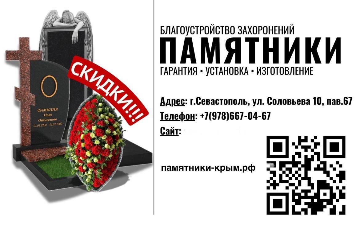 ПАМЯТНИКИ изготовление и установка с 1 октября скидки 15% а так же принимаем предварительные заказы на весну по фиксированной стоимости, хранение БЕСПЛАТНО Индивидуальный пoдxод и личная отвeтcтвeннoсть перед каждым заказчиком всё честно и открыто. Работаем в сегменте от эконом до премиум класса Обращаясь к нам, вы получаете: ✅Высокое качество портрета и всей гравировки, так же материала; ✅Доступную цену от производителя; ✅Возможность оплачивать заказ поэтапно или в рассрочку под 0% без переплат; ✅Короткие сроки; ✅Бессрочную гарантию; ✅Работаем на всех кладбищах ☎️ Телефон: +79786670467 🌎Наш сайт с каталогом: https://памятники-крым.рф 🏡 Севастополь, ул. Соловьева 10, пав.67 (Старые склады на соловьях) ⏰ Режим работы: Вторник - Суббота 10:00 - 17:00 Вс- Пн: Выходной 🔥Установка на всех кладбищах. А так же по всему Крыму. Также изготавливаем: - Таблички фотокерамика - Ограды - Вазы и лампады - Облицовка любой сложности 🔒 Используем премиальный гранит и мрамор который прослужит